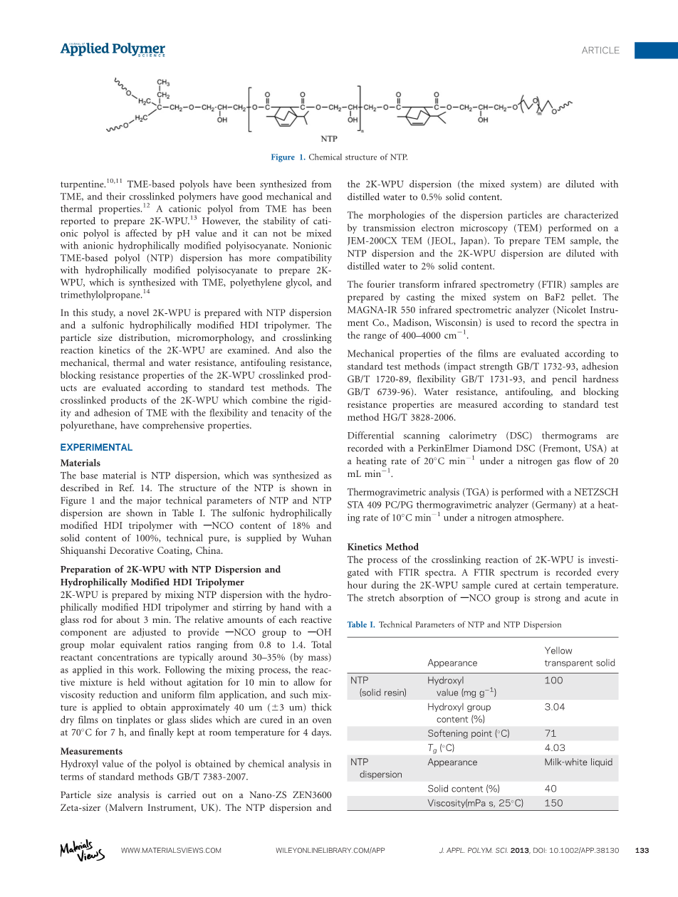 基材是NTP的分散,这是合成在文献中描述的NTP结构图1和NTP和NTP分散的主要技术参数,显示在表1.磺酸亲水改性HDI三聚体与18%和100%,固含量安可内容显示技术的纯,是由中国武汉shiquanshi装饰涂料供给。