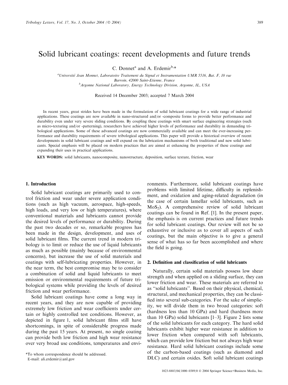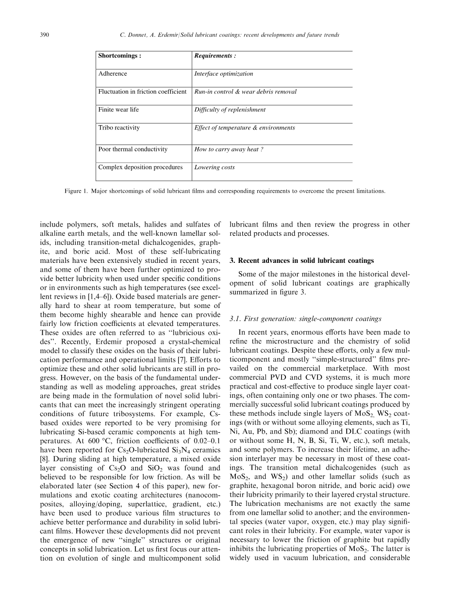 作为硬涂层系统,多组分润滑涂层也是由两个或两个以上的涂层,颗粒或纤维组成的。多层涂层包括两个或更多的材料的周期性重复的结构或薄片,厚度可达几十微米(如果每个薄片的厚度是在纳米范围内,这些薄膜通常被归类为超晶格,如在第3.3节中讨论)。一般情况下,多层固体润滑剂涂层区分的夹心层,其中包括几个叠加的薄膜具有互补的机械/摩擦学性能。这第二代一般fabri392 C.多尼,A.埃尔德米尔/固体润滑涂层:最近的发展和未来的趋势相结合,一个复杂的固体润滑剂3.1节中描述的另一个软或硬层。例如,一个由锡和薄的MOS 2薄膜复合涂层系统被证明具有优异的摩擦学性能,特别是在金属切削和成形操作相比,锡或MOS 2单。在这样的多组分涂料的不同结构的细节可以在文献中发现。【2.33社会]。结合几个结构和组合物在一个涂层中的其他优点包括实现各种个人的物理性质(即,扩散阻挡 低摩擦),减少的不匹配的机械和化学性质之间的基板和涂层(主要是为了提高附着力),控制的残余应变,因此应力在涂层,防止裂纹形成的严重的操作条件下,和增强的硬度和/或韧性,通过允许它们在负载偏转时,在每个其他当他们在负载转移。真空技术的多功能性(见第4节)和复用/混合过程的出现导致了这二代涂料的相当大的进步,最近发现,在运输和制造行业的主要工业应用。多组分涂层和多层极好的最新概况可在文献[ 26 ]发现。