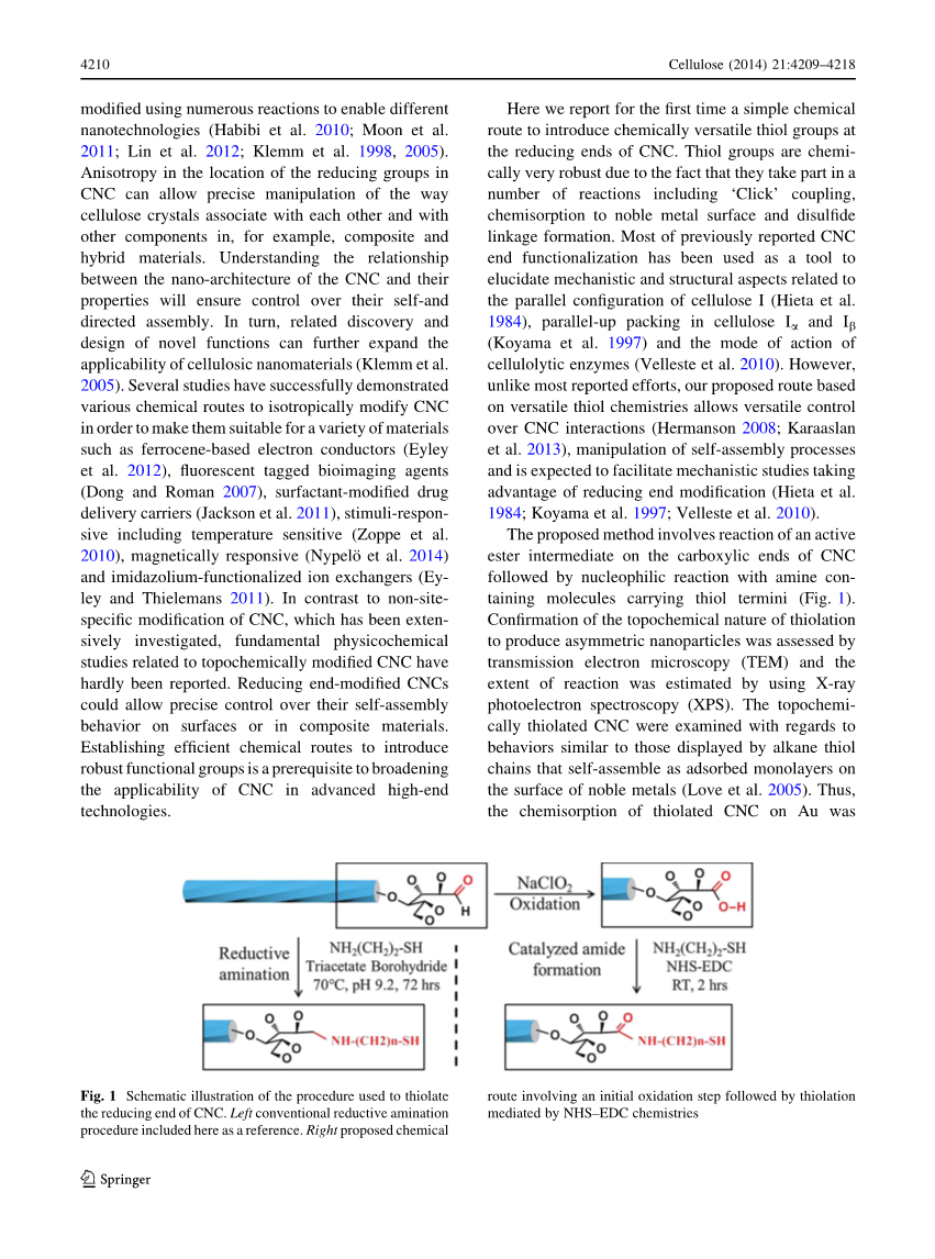我们所提出的方法是在活跃的酯中将CNC末端变为羧基,然后通过与胺的亲核反应最终生成携带硫醇分子基团的末端。利用硫醇化物的局部化学性质来生产非对称的纳米粒子可以通过透射电子显微镜TEM来评估,而它的反应范围也可以通过使用X射线光电子能图来预估。局部硫醇化的CNC与含有硫醇基团的烷烃链所表现出的行为类似,可以自拼接形成单分子层吸附在贵金属表面。因此,硫醇化的CNC在金表面的化学吸附可以使用耗散型石英晶体微天平来观察,也可以说明各自吸附膜的粘弹性。该方法旨在改良以前的生成还原性末端基团的程序。
