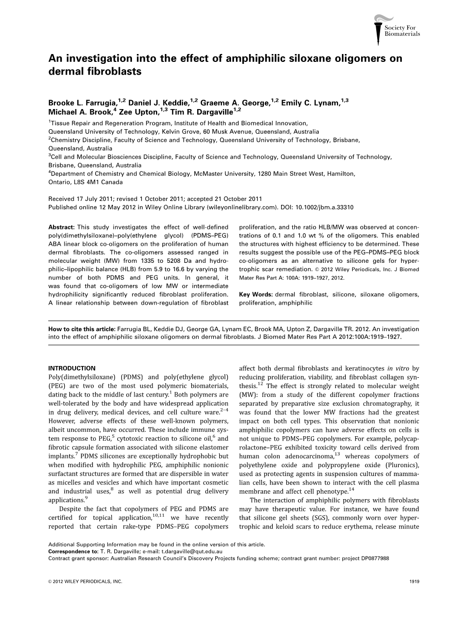 本文介绍了聚二甲基硅氧烷-聚乙二醇(PDMS-PEG)ABA型线性块状低聚物对人类皮肤成纤维细胞增殖的影响。根据PDMS和PEG两种单元分子量和尺寸的差异,已被检测到的这种低聚物的分子量可从1335到5208不等,且亲水亲油平衡值(HLB)可从5.9到16.6变化不等。总体而言,研究表明低分子量或具有中等亲水性的共聚物能明显地减少成纤维细胞的增殖。在浓度为0.1和1.0wt%的低聚物中,成纤维细胞增殖和HLB/MW的比率之间存在反向线性关系。这有利于确定最高效结构的构建。这些结论证明PEG-PDMS-PEG块状共聚物有可能替代有机硅凝胶来修复增生性瘢痕。
