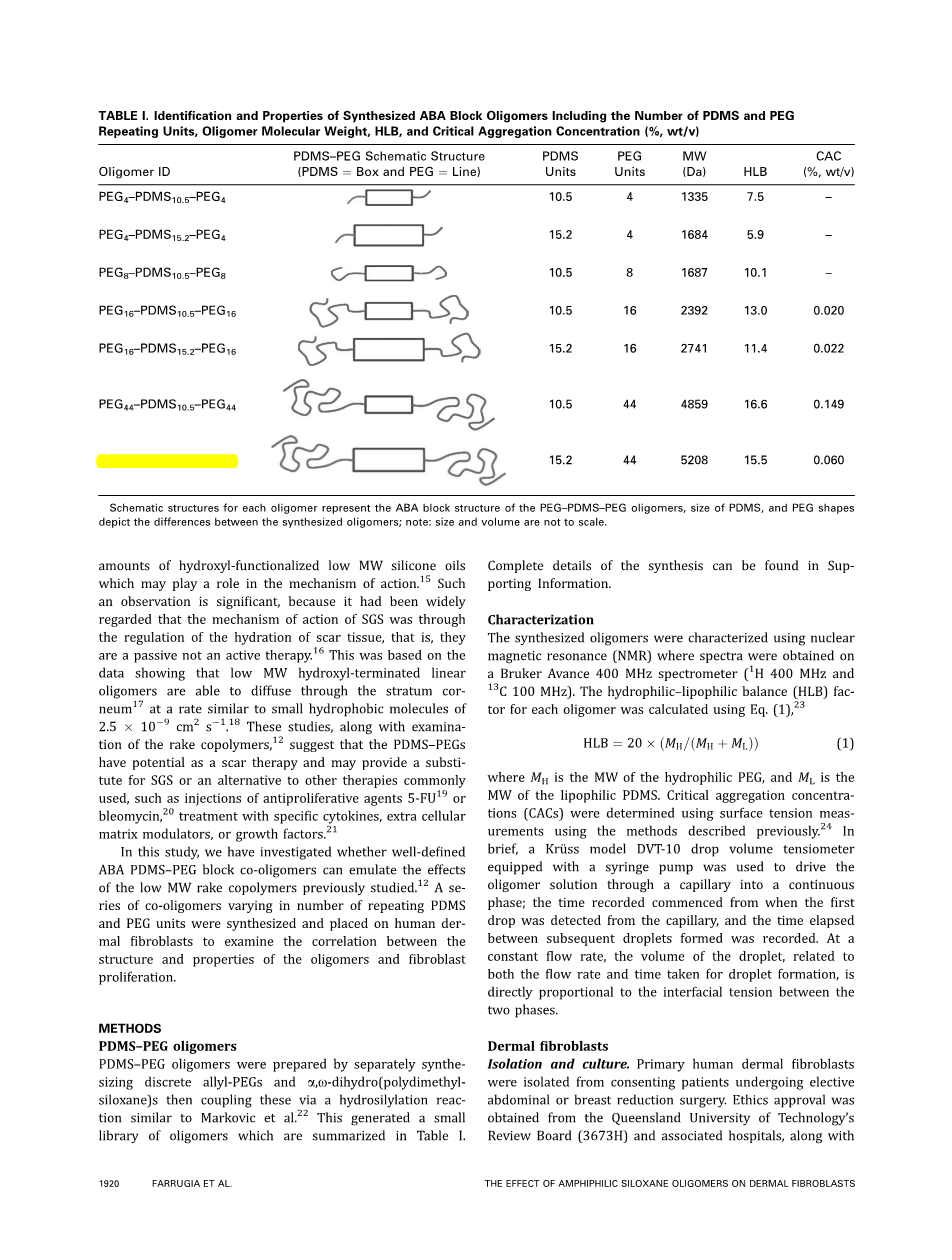 本研究检测了ABA型PDMS-PEG块状共聚物能否产生和之前研究过的低分子量梳形共聚物相同的效果。本团队合成一系列具有不同的PDMS和PEG重复单元数的共聚物并放置于人类表皮成纤维细胞上以研究这种低聚物的结构和性质与成纤维细胞增殖之间的关系。