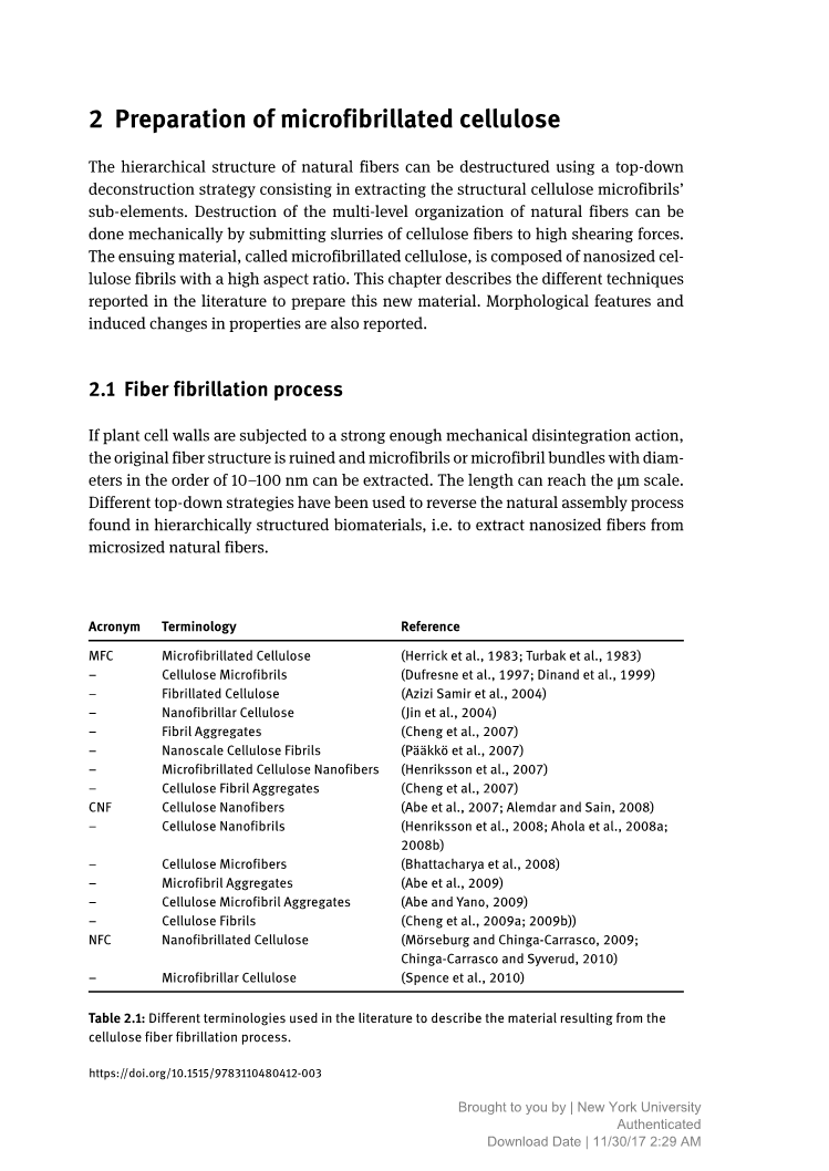 表2.1:文献中用于描述由纤维素纤维原纤化过程产生的材料的不同术语。