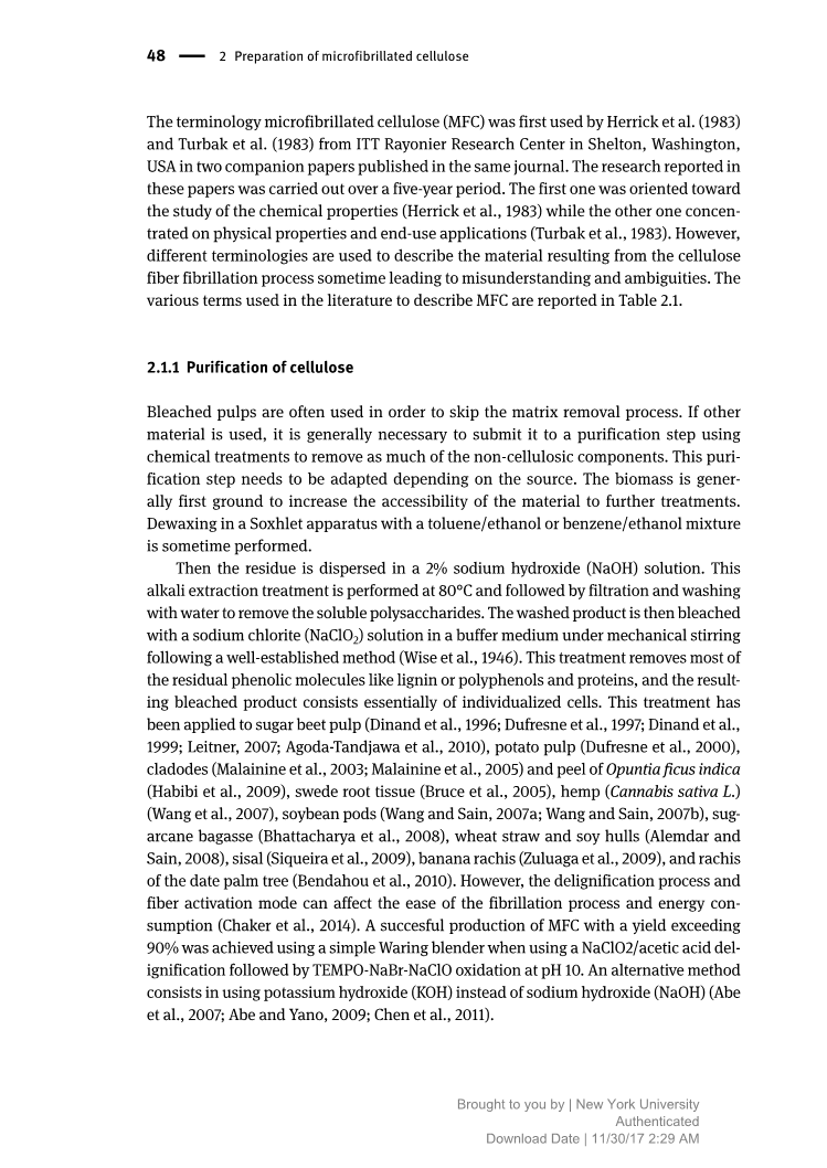 术语微纤化纤维素(MFC)首先由来自美国华盛顿谢尔顿的ITT Rayonier研究中心的Herrick等人(1983)和Turbak等人 (1983年)在同一期刊上发表的两篇配套论文使用, 所报道的这项研究进行了五年。 第一篇是研究化学性质(Herrick等,1983),而另一个则集中在物理性质和最终用途应用(Turbak等,1983)。 然而,使用不同的术语来描述由纤维素纤维原纤化过程产生的材料,有时会导致误解和模糊。 表2.1中报道了文献中用于描述MFC的各种术语。
