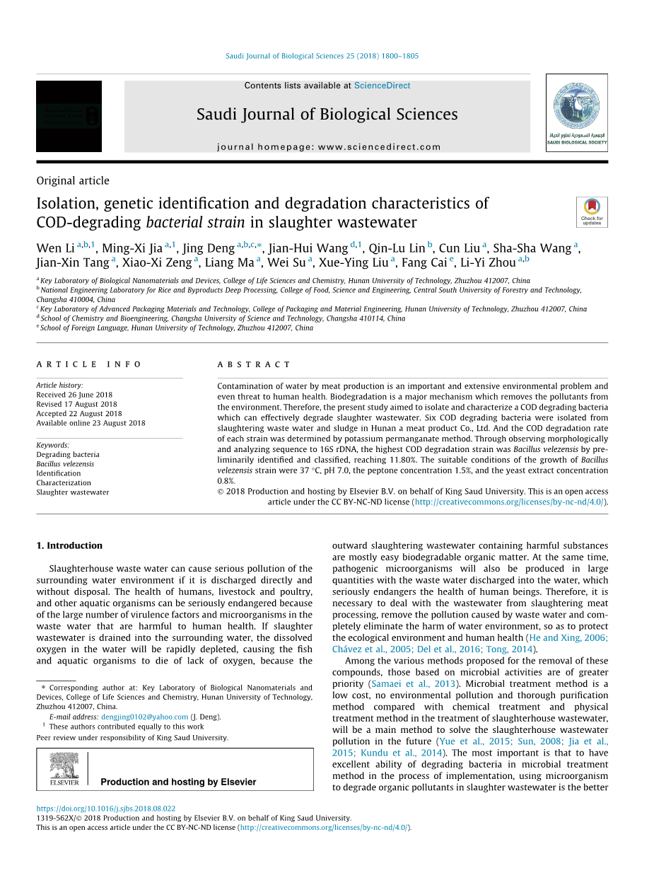 The slaughter wastewater and sludge contaminated with COD strain were the source for bacterial isolation. Samples were collected into 1000 ml sterilized glass bottles from eight sites in a Hunan meat product Co., Ltd on June 2016, and immediately carried to the laboratory and stored in a refrigerator prior at 4 C to use.