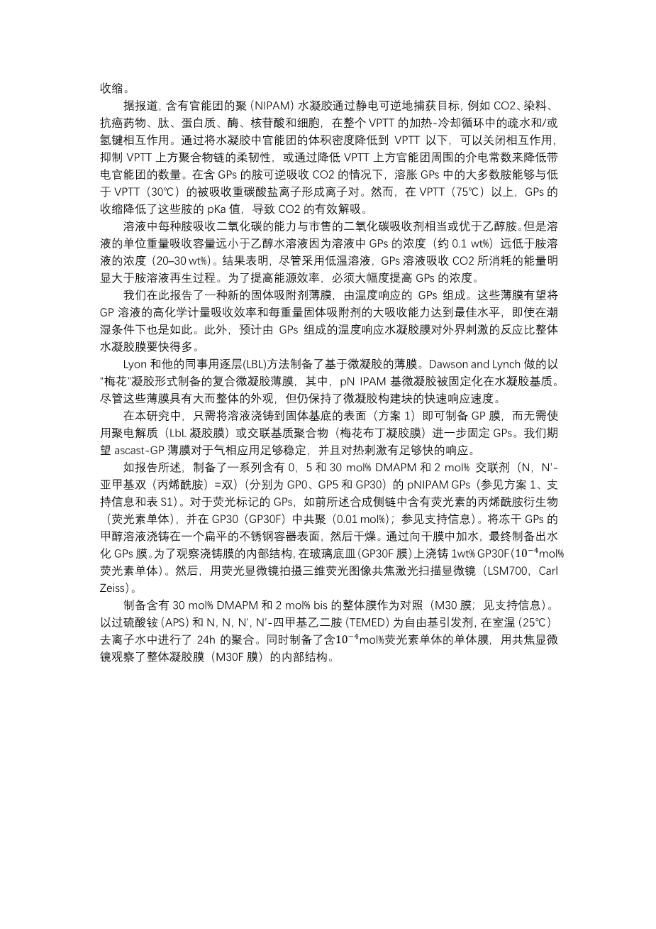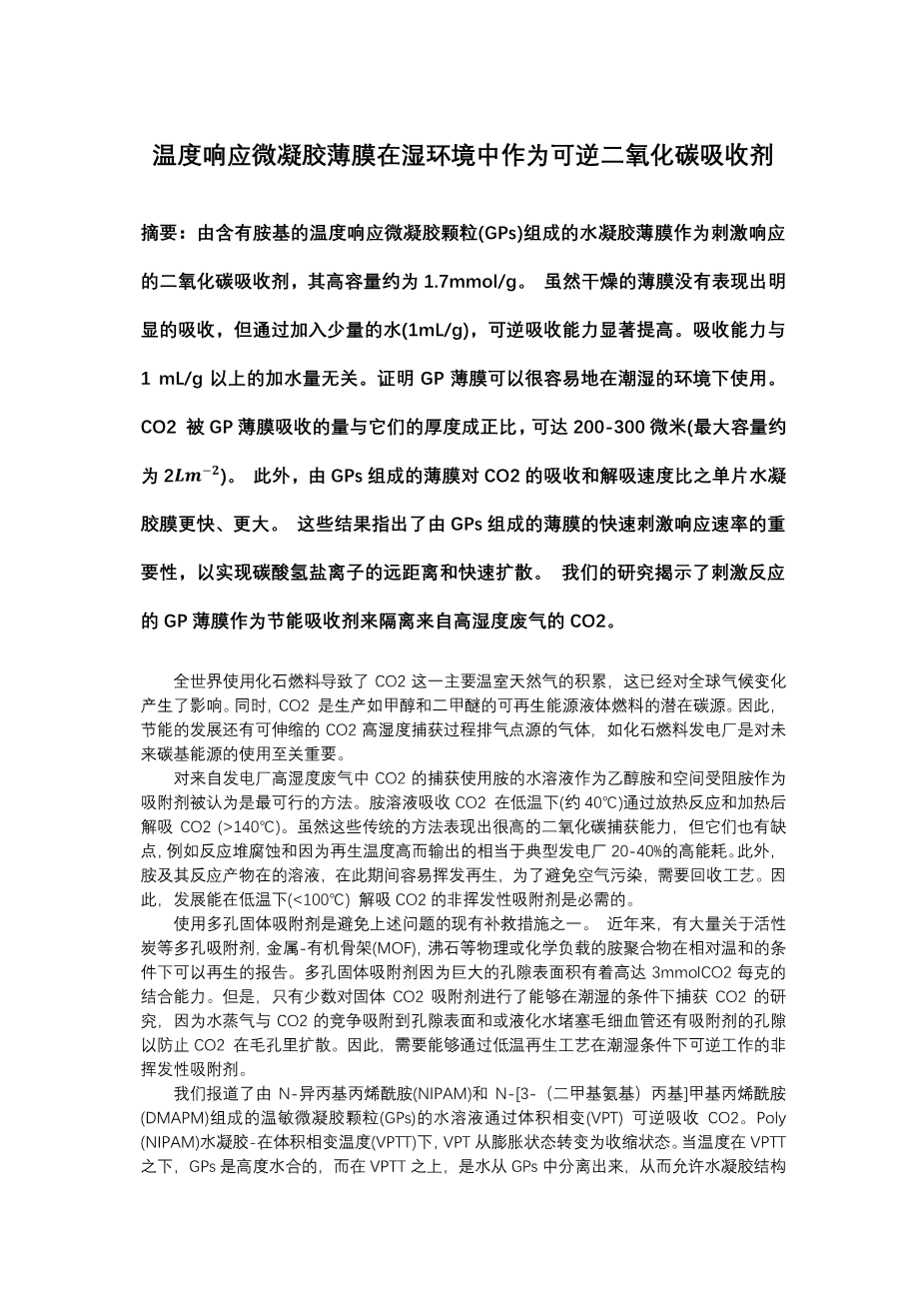 - 温度响应微凝胶薄膜在湿环境中作为可逆二氧化碳吸收剂外文翻译资料
