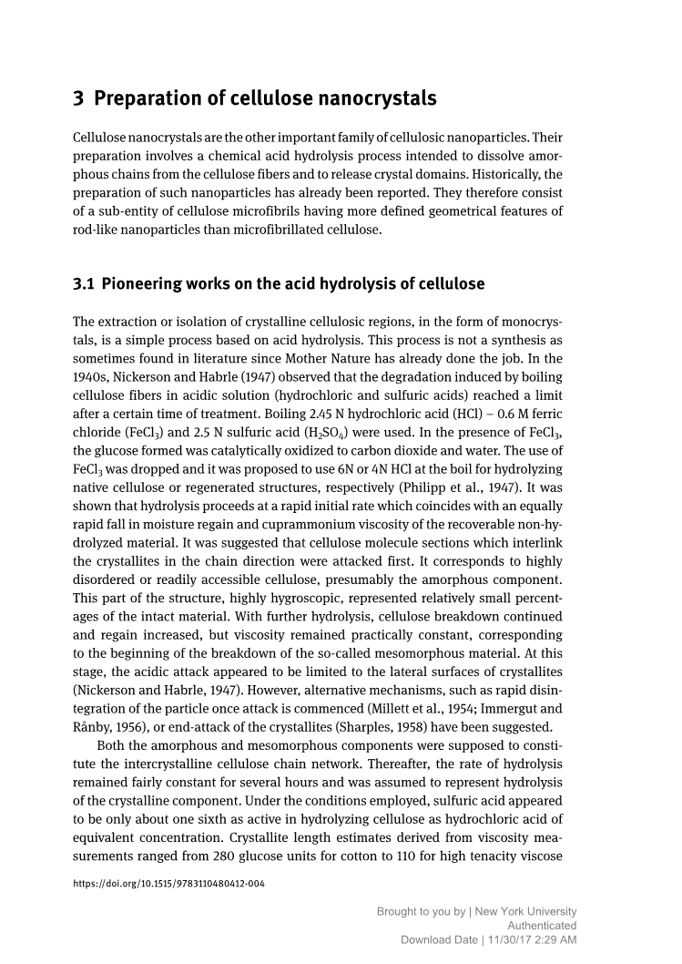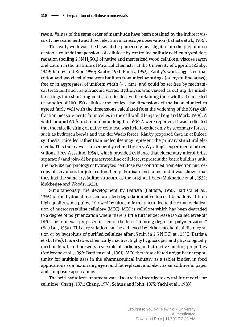 以单晶形式提取或分离晶体纤维素区域是一个简单的酸水解工艺。这个过程并不是有时我们在文献里看到的合成,因为大自然已经完成了这一工作。在20世纪40年代,Nickerson和Habrle (1947)观察到,在一定时间的处理下,沸腾的纤维素纤维在酸性溶液(盐酸和硫酸)中降解达到了极限。煮沸2.45N盐酸(HCl)-0.6M氯化铁(FeCl3)和2.5硫酸(H2SO4)。在FeCl3存在的情况下,葡萄糖被催化氧化生成水和二氧化碳。之后FeCl3的使用被放弃,提出了可以在沸腾时分别使用6N或4N HCl水解原生纤维素或再生结构(Philipp等人, 1947)。结果表明,水解反应的初始速率很高,与可回收的非水解物的回潮率和铜铵粘度的下降速度一样快。有人提出了在链方向上连接晶体的纤维素分子截面首先受到攻击的观点。它对应着高度无序或者容易接近的纤维素,大概是无定形组分。这部分结构高度吸湿,在完整的材料中所占的比例相对较小。随着进一步的水解,纤维素的分解继续进行,重新获得增加,但粘度实际上保持不变,这与所谓的中形态物质的分解开始时是一致的。在这个阶段,酸性攻击似乎仅限于晶体的外侧表面(Nickerson和Habrle, 1947)。可是,也提出了其他机制,如一旦攻击开始迅速解体的粒子(Millett等人, 1954; Immergut和Raring;nby, 1956),或微晶的末端攻击(Sharples, 1958)。