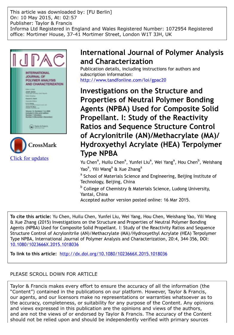 复合固体推进剂中中性聚合物粘合剂(NPBA)的结构和属性研究。 I:研究丙烯腈(AN)/丙烯酸甲酯(MA)/丙烯酸羟乙酯(HEA)三元共聚物型NPBA的竞聚率和序列结构控制外文翻译资料