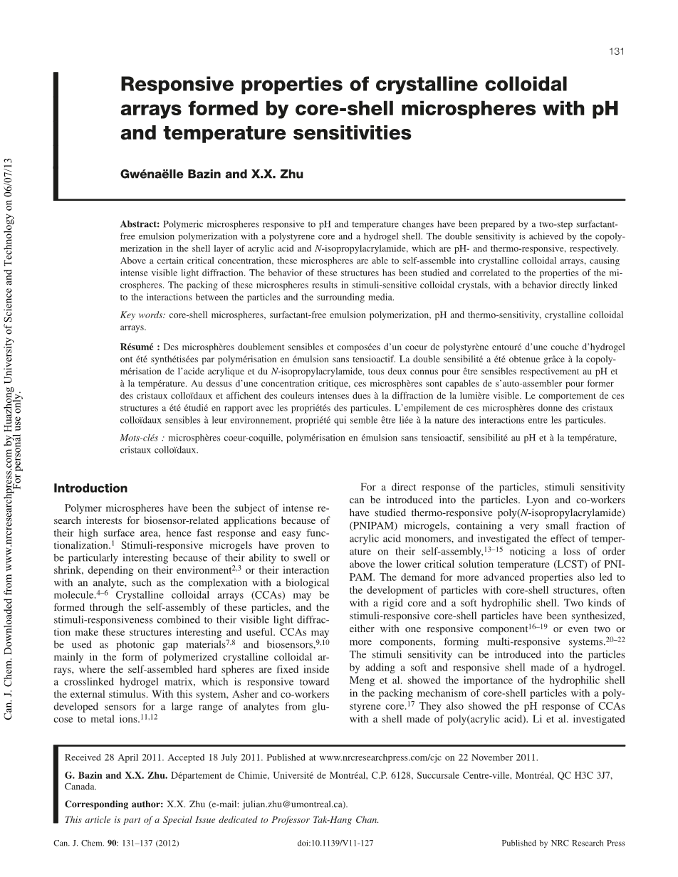 对于颗粒的直接响应,可以将刺激灵敏度引入颗粒中。里昂及其同事研究了热响应性聚(N-异丙基丙烯酰胺)(PNIPAM)微凝胶,其中含有极少量的丙烯酸单体,并研究了温度对其自组装的影响,注意到有序的损失。 PNIPAM的临界溶解温度(LCST)较低。对更先进性能的需求也导致了具有核 - 壳结构的颗粒的发展,通常具有刚性核和柔软的亲水壳。已经合成了两种刺激响应性核 - 壳颗粒,其具有一种响应组分或甚至两种或更多种组分,形成多响应系统。通过添加由以下组成的柔软且响应性的壳,可以将刺激灵敏度引入到颗粒中。水凝胶。孟等人。表明亲水壳在具有聚苯乙烯核的核 - 壳颗粒的填充机理中的重要性。他们还显示了具有由聚(丙烯酸)制成的壳的CCA的pH响应。李等人。使用聚(N-异丙基丙烯酰胺)壳研究了对温度的响应,并注意到衍射峰的移动。在这项工作中,微球体是通过表面活性剂自由乳液聚合与聚苯乙烯核心和水凝胶壳合成的。壳体由聚(丙烯酸)制成,用于pH敏感性,丙烯酸和N-异丙基丙烯酰胺的共聚物,对pH和温度都具有双重敏感性。这些颗粒很容易自组装成CCA并显示可见光衍射。已经研究和比较了响应于pH和温度变化的CCA的填充机制和性质。初步结果表明,该反应与微球之间存在的相互作用密切相关。