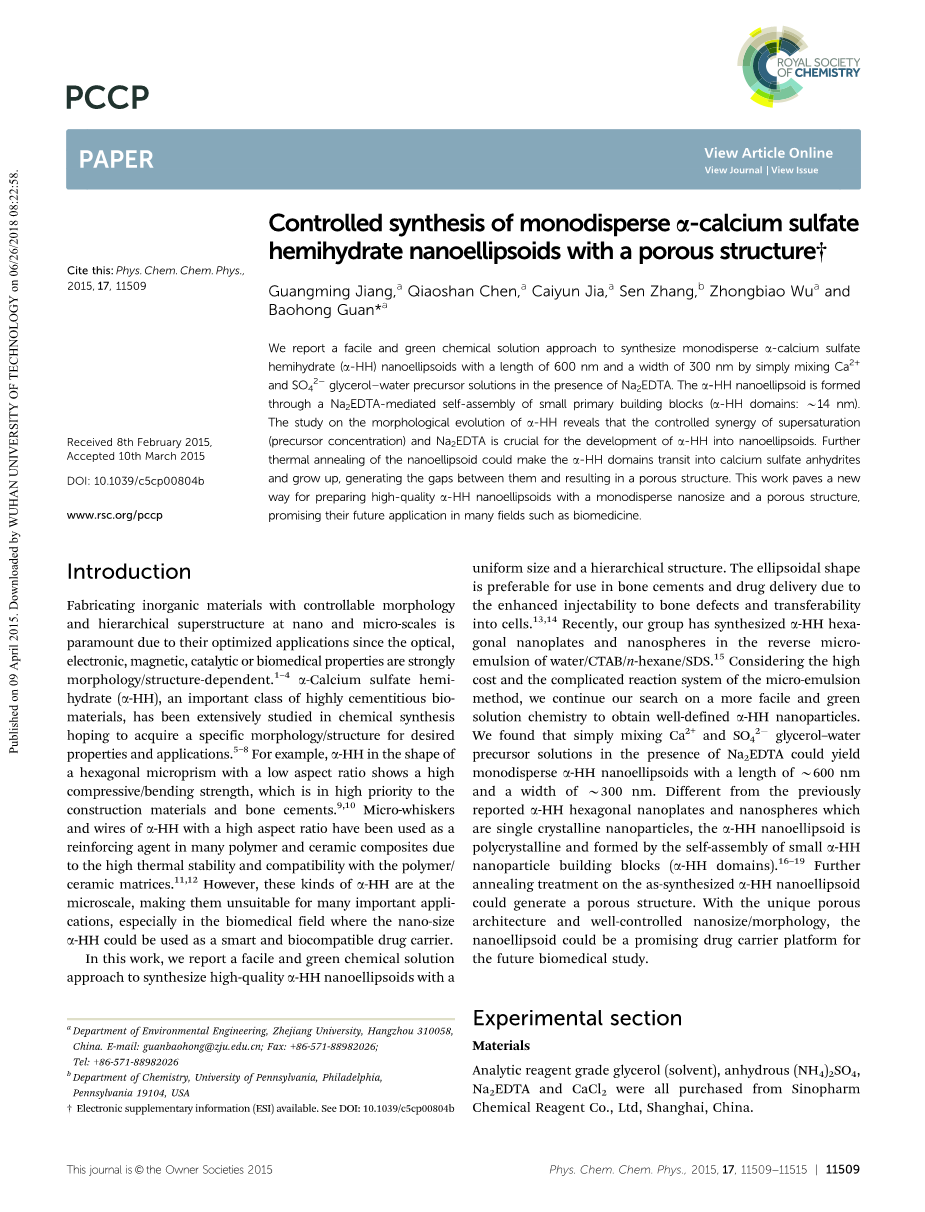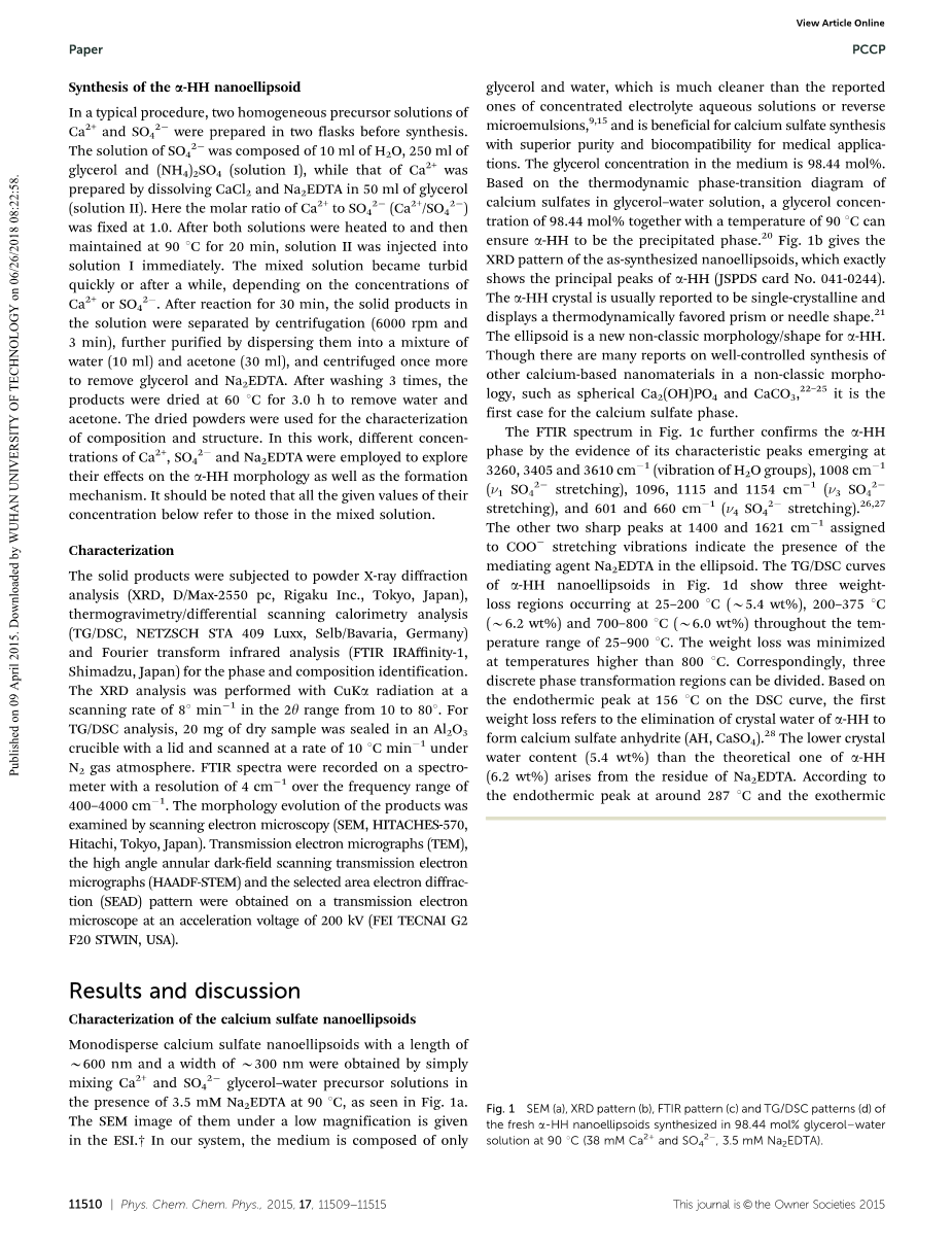 由于无机材料在光学、电子、磁性、催化或生物医学等方面具有很强的形态/结构依赖性,因此在纳米和微尺度上制备具有可控形态和层次上层结构的无机材料是其优化应用的关键。半水合硫酸钙(a- hh)是一类重要的高胶凝性生物材料,在化学合成中得到了广泛的研究,希望获得一种特殊的形貌/结构,以获得预期的性能和应用。以a- hh为例,低展弦比的六角形微棱柱体具有较高的抗压/抗弯强度,是建筑材料和骨水泥的首选材料。高纵横比的a- hh微晶须和微丝由于其高的热稳定性和与聚合物/陶瓷基体的相容性,在许多聚合物和陶瓷复合材料中被用作增强剂。然而,这些类型的a- hh是在微尺度,使他们不适合许多重要的应用,特别是在生物医学领域,纳米尺寸的a- hh可以作为一个智能和生物相容性药物载体。在这项工作中,我们报告了一种简便和绿色的化学溶液方法来合成高质量的a- hh纳米椭球体,具有均匀的尺寸和层次结构。由于增强了骨缺损的可注射性和细胞的可转移性,椭球形更适合用于骨水泥和药物递送。近年来,我们在水/CTAB/正己烷/SDS反相微乳液中合成了a-HH六角形纳米板和纳米球。考虑到微乳液法的高成本和复杂的反应体系,我们继续研究一种更简便、更绿色的溶液化学,以获得定义明确的a-hh纳米颗粒。我们发现,在Na2EDTA存在下,简单地将Ca2 和SO4 2甘油水前驱体溶液混合,就可以得到长度为B600 nm、宽度为B300 nm的单分散a- hh纳米椭球体。与以往报道的单晶纳米颗粒的a-HH六角形纳米板和纳米球不同,a-HH纳米椭球体是多晶的,由小的a-HH纳米颗粒构建块(a-HH结构域)自组装而成。对合成的a- hh纳米椭球体进行进一步退火处理可以得到多孔结构。纳米椭球体具有独特的多孔结构和良好的纳米尺寸/形貌控制,有望成为未来生物医学研究的药物载体平台。