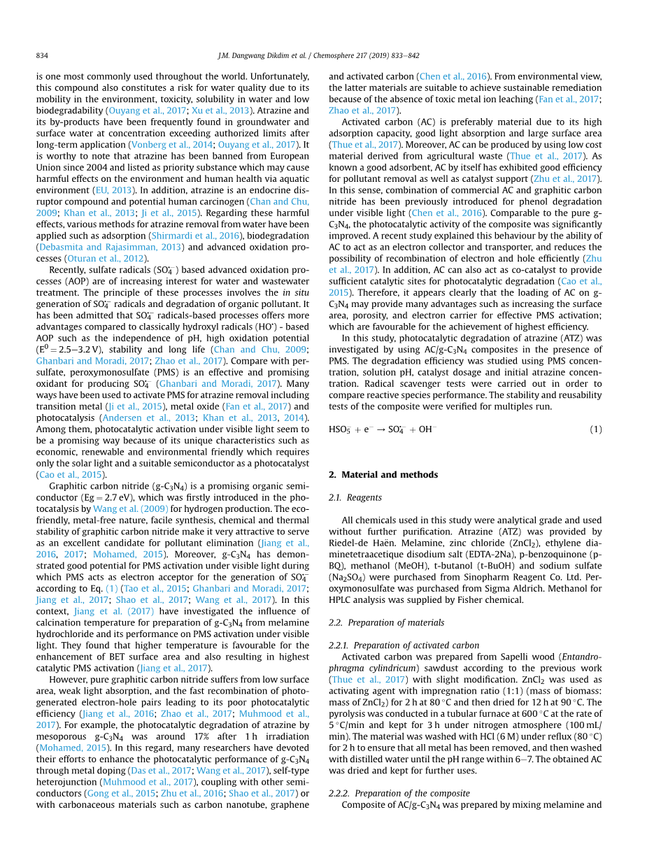 在可见光辐射的条件下,过氧化单硫酸盐能够提升阿特拉津在活性炭/石墨相氮化碳复合物的光催化降解效果。