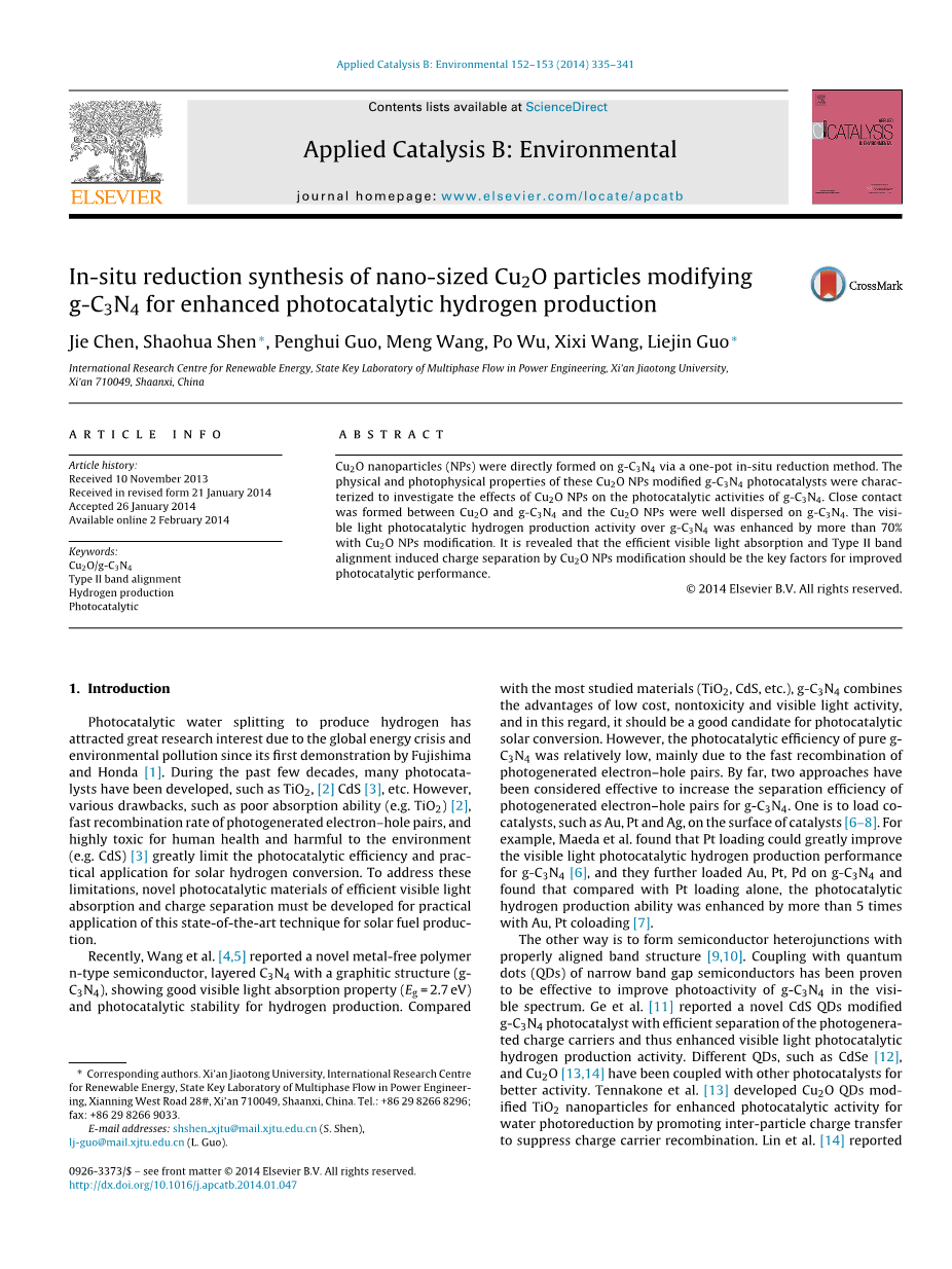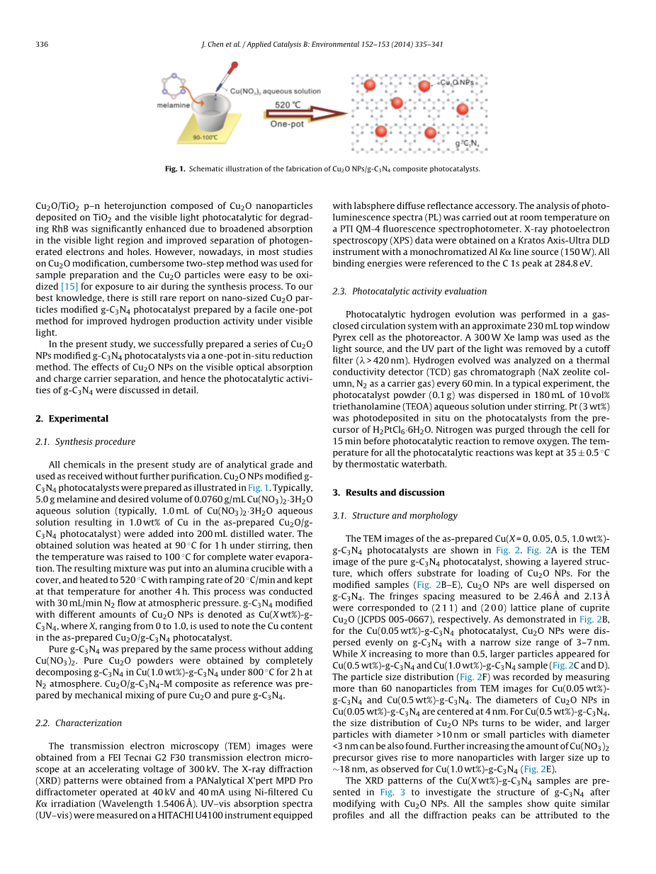另一种方法是形成具有合适对准的带结构的半导体异质结[9,10]。已经证明,与窄带隙半导体的量子点(QDs)耦合可有效地改善g-C3N4在可见光谱中的光活性。戈等人[11] 报道了一种新型CdS QDs改性的g-C3N4光催化剂,它有效地分离了光生电荷载体,从而增强了可见光光催化制氢活性。不同的QDs,如CdSe [12]和Cu2O [13,14]已经与其他光催化剂结合,以获得更好的活性。Tennakone等人[13]开发了Cu2O QDs改性TiO2纳米粒子,通过促进粒子间电荷转移来抑制电荷载流子复合,从而提高水的光还原光催化活性(的方法)。林等人 [14]发表Cu2O / TiO2p-n异质结由沉积在TiO2上的Cu2O纳米颗粒组成,可见光光催化降解RhB(罗丹明B)由于可见光区域的吸收变宽和光生电子和空穴的分离得到改善而显着增强。 然而,如今,在大多数关于Cu2O改性的研究中,使用繁琐的两步法制备样品,并且Cu2O颗粒由于在合成过程中暴露于空气中而易于被氧化[15]。据我们所知,目前关于纳米级Cu2O颗粒改性g-C3N4光催化剂的报道仍然很少,这种光催化剂采用简便的一步法制备,可在可见光下提高产氢活性。