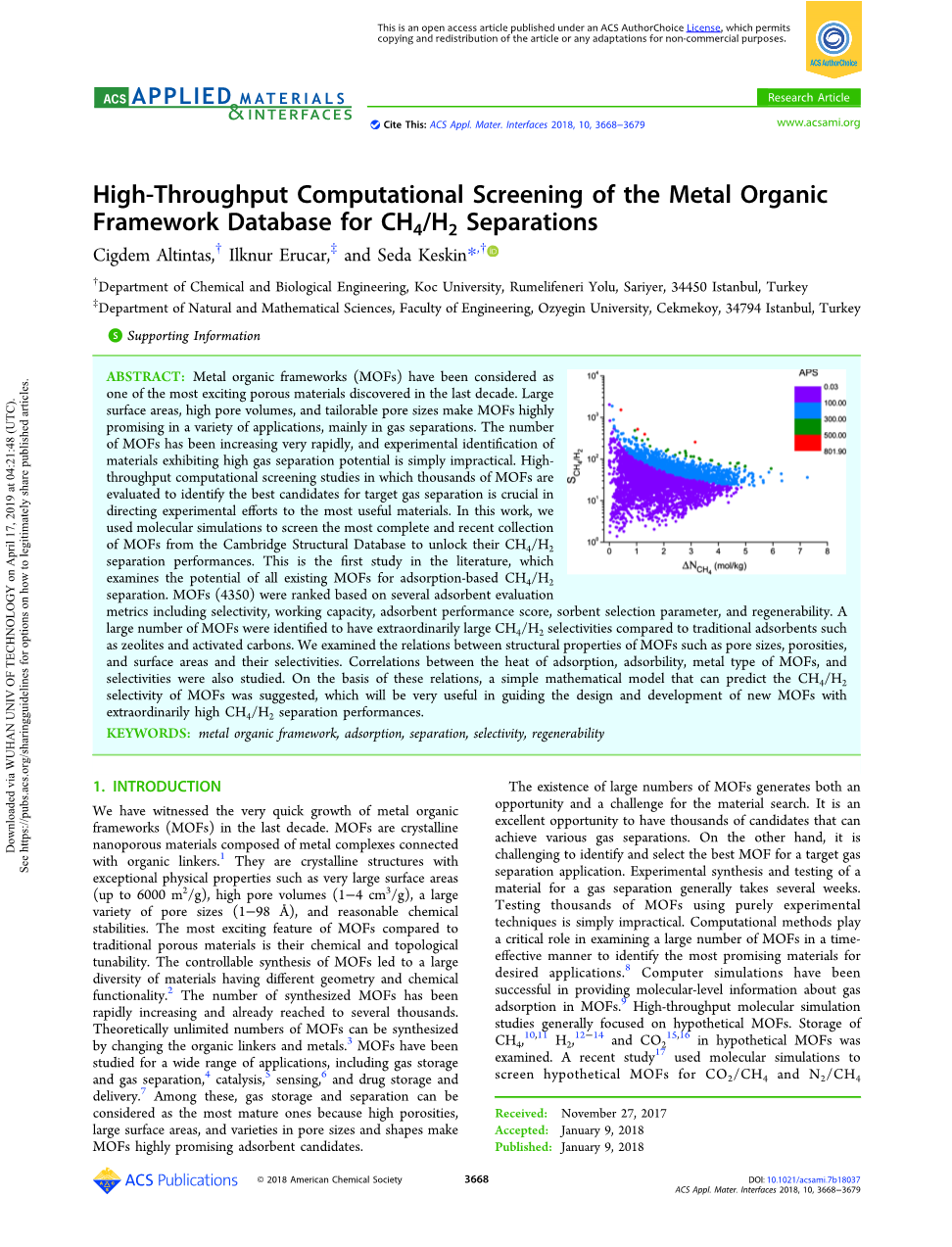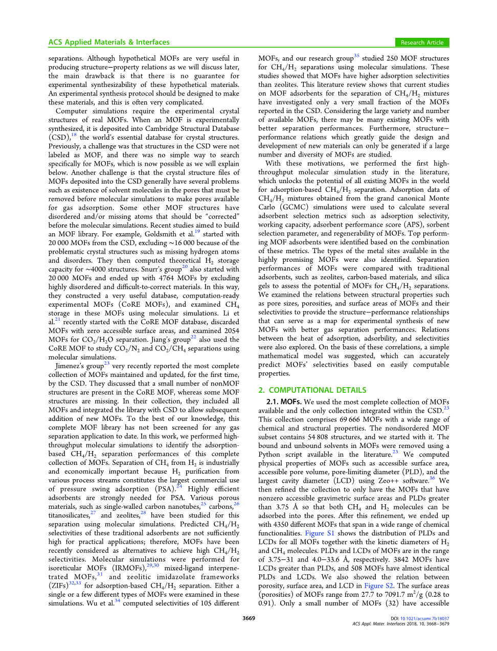 Jimenez课题组23最近报道了由CSD首次维护和更新的最完整的MOFs集。鉴于一些MOF结构缺失,他们讨论了在CoRE MOF中存在的少量非MOF结构。在他们的集合中,包含了所有MOFs并与CSD数据库整合在一起,以便之后添加新的MOFs。据我们所知,这个完整的MOF库迄今为止尚未针对任何气体分离应用进行筛选。在这项工作中,我们利用高通量分子模拟确定这一完整MOF集的吸附CH4 / H2分离性能。从H 2中分离CH4在工业上和经济上都十分重要,因为来自各种工艺流的H2纯化构成了变压吸附(PSA)的最大商业用途。24 PSA迫切需要高效吸附剂。目前已经使用分子模拟研究了用于分离的各种多孔材料,例如单壁碳纳米管,25碳,26钛硅酸盐,27和沸石28。在实际应用中,所预测的这些传统吸附剂CH4 / H2的选择性是不够高的;因此,MOFs近年来被认为是实现CH4 / H2高效分离的替代材料。对网状金属有机骨架材料(IRMOFs),29,30混合配体互穿MOF31和沸石咪唑骨架材料(ZIFs)32,33进行分子模拟,用于CH4 / H2的吸附分离。在这些模拟中检测出了单个或几个不同类型的MOFs。Wu等人34计算了105种不同MOFs的选择性,我们的研究小组35使用分子模拟研究了250种MOF结构用于CH4 / H2的分离。这些研究表明,MOFs比沸石具有更高的吸附选择性。该文献综述表明,目前关于MOFs吸附剂分离CH4 / H2混合物的研究仅研究了CSD报道的MOFs中的很小一部分。考虑到可用MOFs的种类和数量的多样性,可能存在许多具有更好分离性能的MOFs。此外,只有研究了大量的多样化的MOFs,才能对新材料的设计和开发以及其结构-性能关系产生指导。