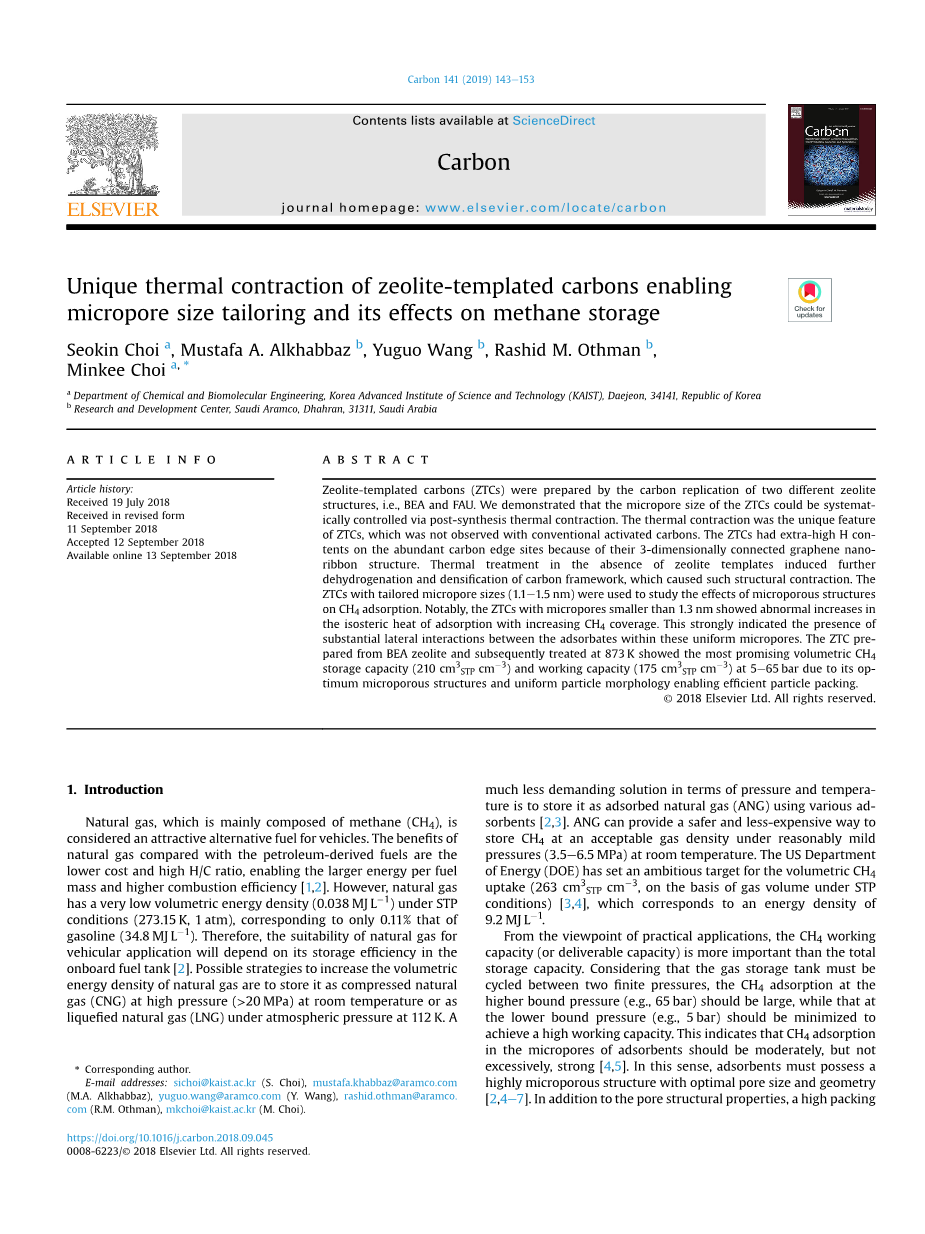 通过两种不同沸石结构即BEA和FAU的碳复制制备沸石模板碳(ZTC)。我们证明了ZTC的微孔尺寸可以通过合成后热收缩系统地控制。热收缩是ZTC的独特特征,常规活性炭未观察到。由于其三维连接的石墨烯纳米带结构,ZTC在丰富的碳边缘位置具有超高H含量。在不存在沸石模板的情况下的热处理诱导碳框架的进一步脱氢和致密化,这导致这种结构收缩。具有定制微孔尺寸(1.1-1.5nm)的ZTC用于研究微孔结构对CH4吸附的影响。值得注意的是,微孔小于1.3nm的ZTC显示出随着CH4覆盖率的增加,等量吸附热的异常增加。这强烈表明在这些均匀微孔内吸附物之间存在显着的横向相互作用。由BEA沸石制备的ZTC随后在873K下处理,由于其最佳的微孔结构和均匀性,在5-65巴下显示出最有希望的体积CH4储存容量(210cm3 STP cm-3)和工作容量(175cm3 STP cm-3),使得有效的颗粒填