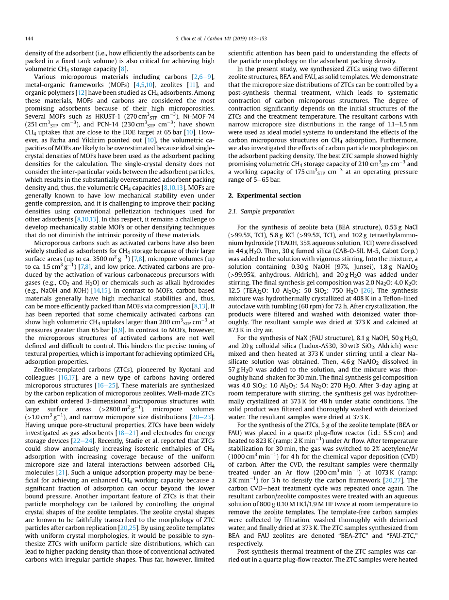 由Kyotani及其同事[16,17]开创的沸石模板碳(ZTC)是一种具有有序微孔结构的新型碳[16-25]。这些材料通过微孔沸石的碳复合合成。制作精良的ZTC可以展示有序的三维微孔结构,具有大的表面积(gt; 2800 m2 g-1),微孔体积(gt; 1.0 cm3 g-1)和窄的微孔尺寸分布[20-23]。 ZTC具有独特的孔结构特性,已被广泛研究为气体吸附剂[18-21]和储能装置用电极[22-24]。最近,据Stadie等人报道,由于微孔尺寸均匀和吸附的CH4分子之间的横向相互作用,ZTCs可以显示CH4吸附的等量焓随着覆盖率的增加而异常增加[21]。这种独特的吸附性质可有利于实现增强的CH4工作能力,因为大部分吸附可发生在下限压力之外。 ZTC的另一个重要特征是它们的颗粒形态可以通过控制沸石模板的原始晶体形状来定制。已知沸石晶体形状在碳复制后忠实地转化为ZTC颗粒的形态[20,25]。通过使用具有均匀晶体形态的沸石模板,可以合成具有均匀粒度分布的ZTC,这可以导致比具有不规则颗粒形状的常规活性炭更高的填充密度。然而,到目前为止,有限的科学注意力已经转移到了理解颗粒形态对吸附剂填充密度的影响。