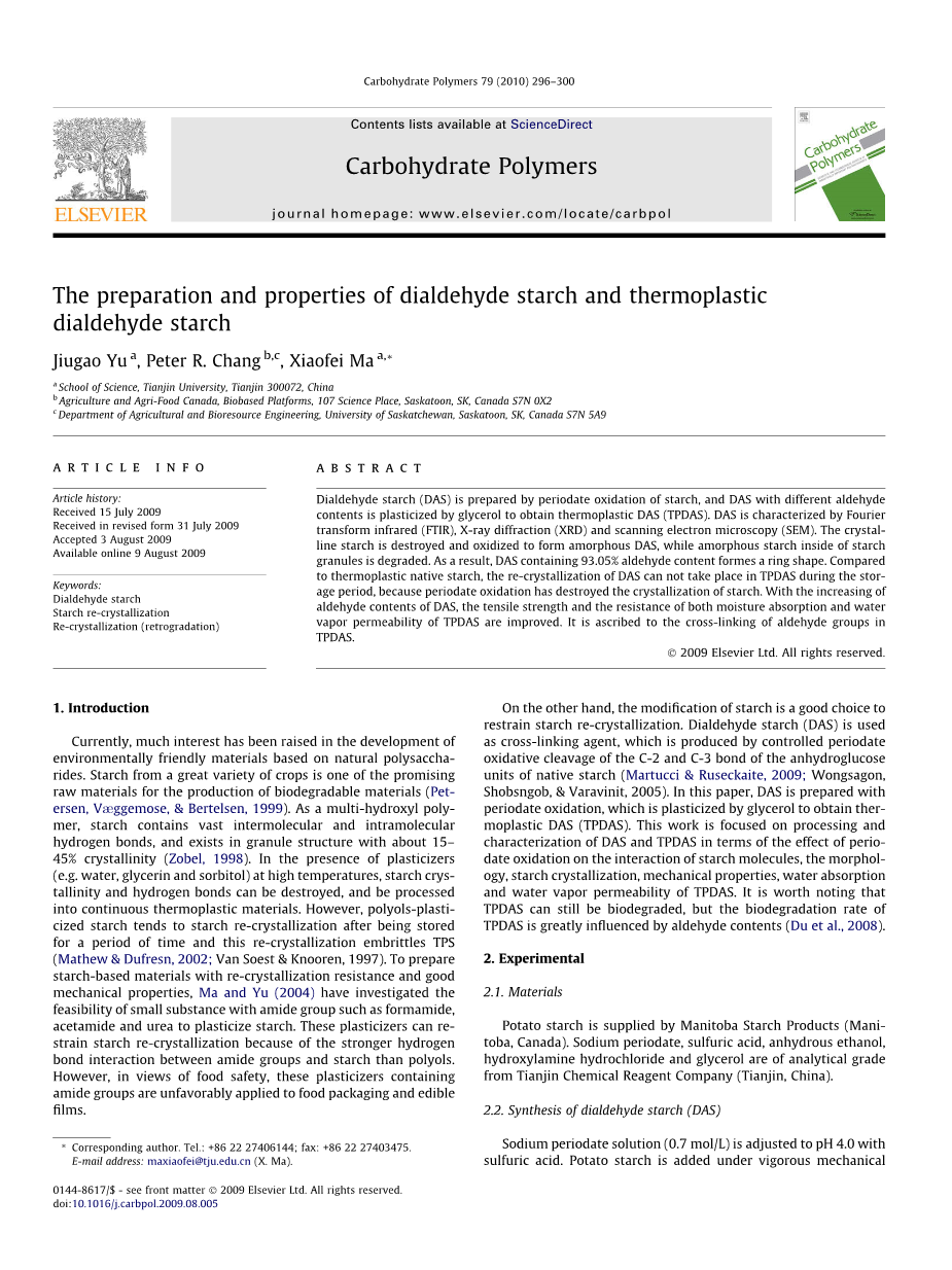 另一方面,淀粉的变异性是抑制淀粉再结晶的良好选择。 双醛淀粉(DAS)用作交联剂,其通过控制天然淀粉的脱水葡萄糖单元的C-2和C-3键的高碘酸盐氧化裂解产生(Martucciamp;Ruseckaite,2009,Wongsagon等,2005)。 在本文中,DAS采用高碘酸盐氧化制备,用甘油增塑,得到热塑性DAS(TPDAS)。 这项工作的重点是DAS和TPDAS的制备和表征,包括高碘酸盐氧化对淀粉分子相互作用的影响,TPDAS的形态,淀粉结晶,机械性能,吸水性和水蒸汽渗透性。 值得注意的是,TPDAS仍然可以生物降解,但TPDAS的生物降解速率受醛含量的影响很大(Du et al,2008)。