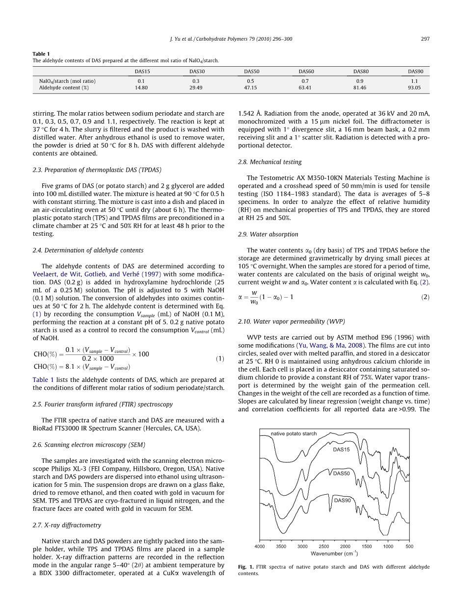 表1列出了在不同摩尔比的高碘酸钠/淀粉的条件下制备的DAS的醛含量