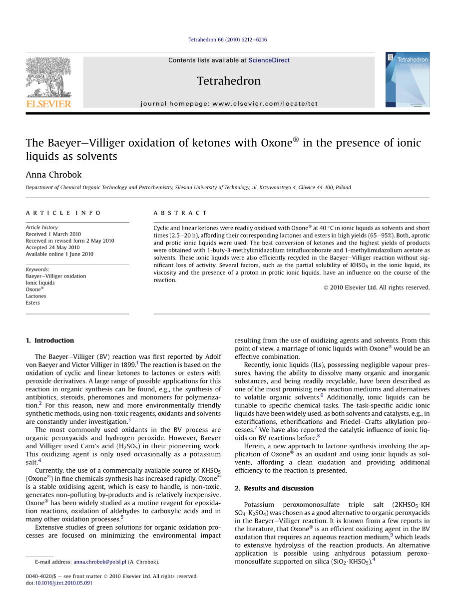 环己酮和线性酮很容易在离子液体作为溶剂的条件下被硫酸氢钾制剂在40℃下氧化并且时间很短(2.5-20个小时),以高产率提供相应的内酯和酯(65-95%)。非质子和质子离子液体都用到了。 酮的最佳转化率和最高产量是通过用1-丁基-3-甲基咪唑四氟硼酸盐和1-甲基咪唑乙酸盐作为溶剂获得的。 这些离子液体在没有显著的损失活性的情况下在拜尔-维力格反应中能够有效地再循环。 有几个因素,如KHSO5在离子液体中的部分溶解度,它