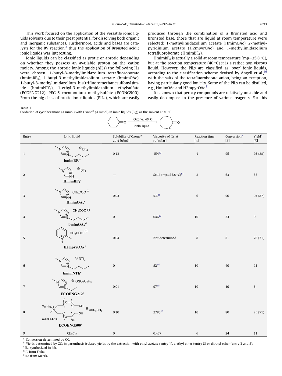 选择离子液体并用Oxone氧化环己酮进行测试。 在40℃。质子和非质子离子液体应用,主要是亲水的,除了bmimNTf 2。