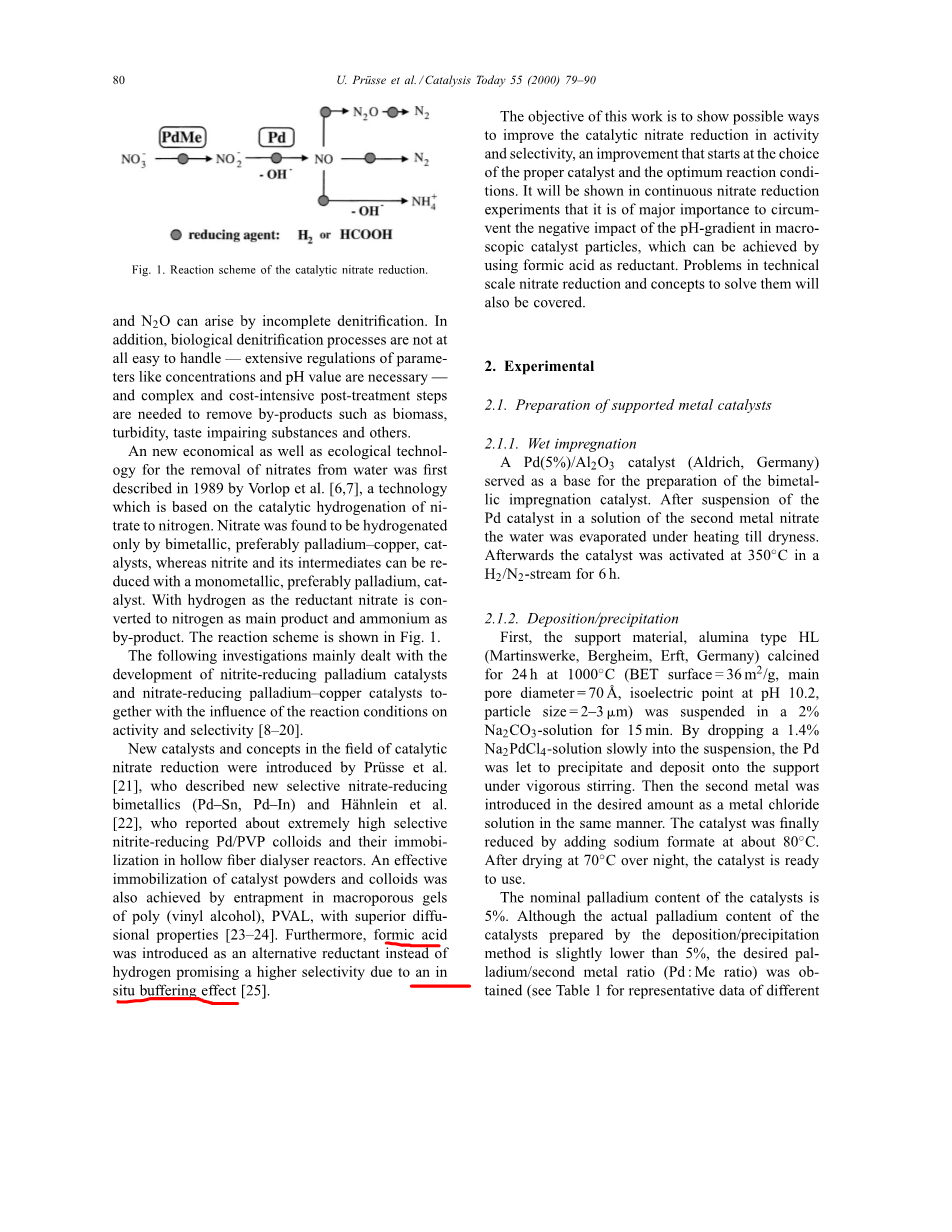 Vorlop等人于1989年首次描述了从水中去除硝酸盐的新的经济和生态技术。 [6,7],一种基于氮化物催化氢化的技术。 发现硝酸盐仅通过双金属,优选钯 - 铜,催化剂进行氢化,而亚硝酸盐及其中间体可以用单金属,优选钯,催化剂进行氢化。 用氢作为还原剂,硝酸盐转化为氮气作为主要产物,铵作为副产物。 反应方案如图1所示。