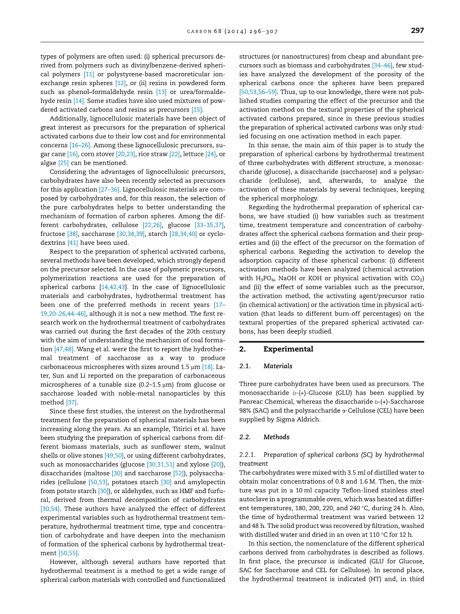 考虑到木质纤维素类前驱物的优势,碳水化合物也已经被选作这项研究的前驱物。木质纤维素类物质是由碳水化合物组成的,因此,选择纯净的碳水化合物作为前驱物可助于更好地理解碳球合成机理。以下这些不同的碳水化合物已被选用:纤维素、葡萄糖、果糖、蔗糖、淀粉或环糊精。