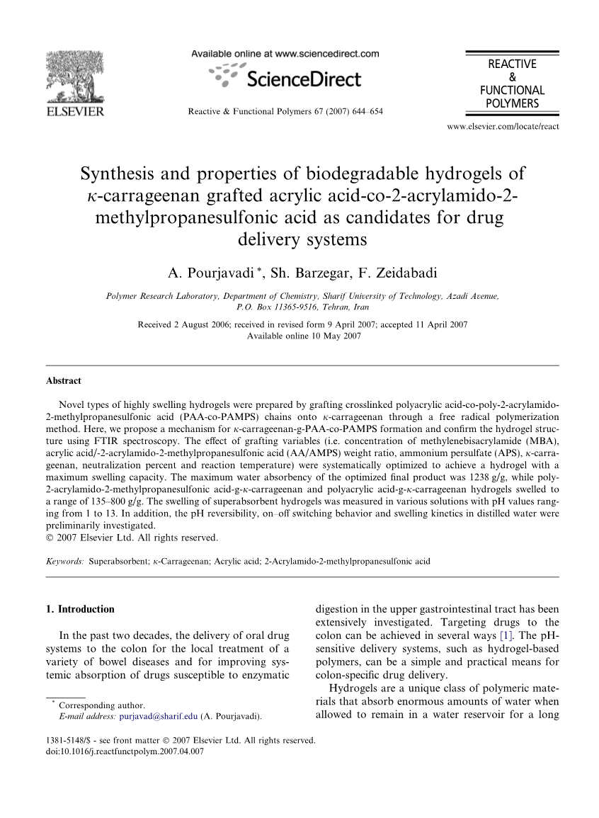 本文描述了在正常大气条件下通过丙烯酸-共聚-2-丙烯酰胺-2-甲基丙磺酸交联接枝到kappa;-卡拉胶上的新型生物聚合物基超吸收性水凝胶的优化合成。 我们研究了水凝胶的膨胀行为对外部环境的反应条件和pH的依赖性。 设计的这种新型水凝胶能够利用kappa;-卡拉胶的生物降解性和聚丙烯酸-共聚-聚-2-丙烯酰胺-2-甲基丙磺酸的pH依赖性。 并且预期所获得的凝胶具有结肠特异性药物递送性质。