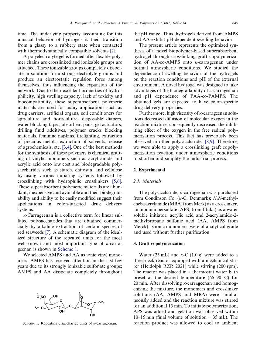 使用APS作为自由基引发剂和MBA作为亲水性交联剂进行丙烯酸和2-丙烯酰胺基-2-甲基丙磺酸到kappa;-卡拉胶上的交联接枝共聚。所提出的接枝和化学交联反应机理列于方案2中。过硫酸盐引发剂在加热下分解生成硫酸根阴离子自由基。自由基从kappa;-卡拉胶的羟基中提取氢以在底物上形成烷氧基。因此,这种过硫酸盐 - 糖类氧化还原体系在基材上形成活性中心,从而从根本上引发丙烯酸-共聚-2-丙烯酰胺-2-甲基丙磺酸的聚合反应,形成接枝共聚物。由于交联剂例如MBA在系统中存在,共聚物由交联结构组成。应该指出,硫酸根离子自由基也可能引发丙烯酸,2-丙烯酰胺-2-甲基丙磺酸或丙烯酸-共聚-2-丙烯酰胺-2-甲基丙磺酸均聚。然而,可能的交联亲水均聚物(聚丙烯酸,聚-2-丙烯酰胺-2-甲基丙磺酸或PAA - co - PAMPS)不会对最终产品的吸收性质造成可观的不希望的影响。为了减少APS对kappa;-卡拉胶主链的自由基降解,在将丙烯酸,2-丙烯酰胺-2-甲基丙磺酸和MBA加入到反应混合物中后加入APS。在以前的工作[10]和Hsu等人报道了这种可能性的提出机制。最近报道了使用过硫酸钾降解壳聚糖的类似观察结果[11]。