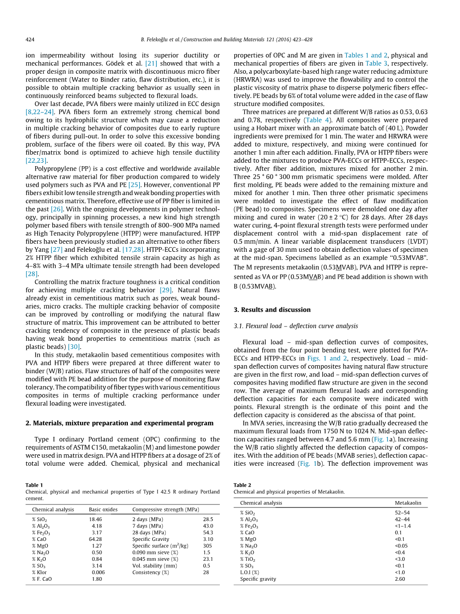 以不同的W / B比率分别制备三个基质,分别为0.53,0.63和0.78(表4)。所有的复合材料均使用Hobart混合器以约40L的批量制备。将粉末成分预混合1分钟。将水和HRWRA分别加入到混合物中,并在每次加入后继续混合1分钟。最后,将PVA或HTPP纤维加入到混合物中以分别生产PVA-ECC或HTPP-ECC。加入纤维后,混合物再混合2分钟。三个25 * 60 * 300毫米棱镜样品被模制。第一次模塑后,将PE珠粒加入剩余的混合物中并再混合1分钟。然后再铸造另外三个棱镜样品,以研究缺陷修饰(PE珠)对复合材料的影响。混合后一天将标本脱模并在水中(20plusmn;2℃)固化28天。水固化28天后,在位移控制下进行4点弯曲强度测试,中间位移率为0.5mm / min。线性可变位移传感器(LVDT),用于测量中间跨度处试样的挠度值。样本标记为例子“0.53MVAB”。 M表示偏高岭土(0.53MVAB),PVA和HTPP表示为VA或PP(0.53MVAB),PE珠添加用B(0.53MVAB)表示。