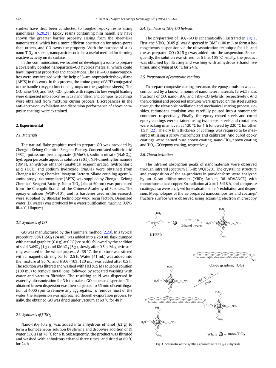 环氧树脂被广泛用作粘合剂,涂料,结构材料和复合基体[20,21]。然而,环氧树脂固有的缺点,制造高温固化环氧树脂溶剂型涂料,这使得他们不可避免地通过溶剂蒸发产生微孔[20,22]。腐蚀性液体介质可以使用产生不良耐腐蚀性的微孔而迅速渗入涂层到被保护的基材中。因此已经进行了广泛的研究来使用纳米填料来增韧环氧树脂[6,20,21]。包含膜纳米填料的环氧树脂已经显示出由片状纳米材料产生的最大阻隔性,其对于微孔具有比其他材料更有效的阻碍,并且GO拥有该性质。为了将纳米TiO 2粘合到片材上,纳米颗粒可以是用于在其表面上形成反应活性的有用方法。