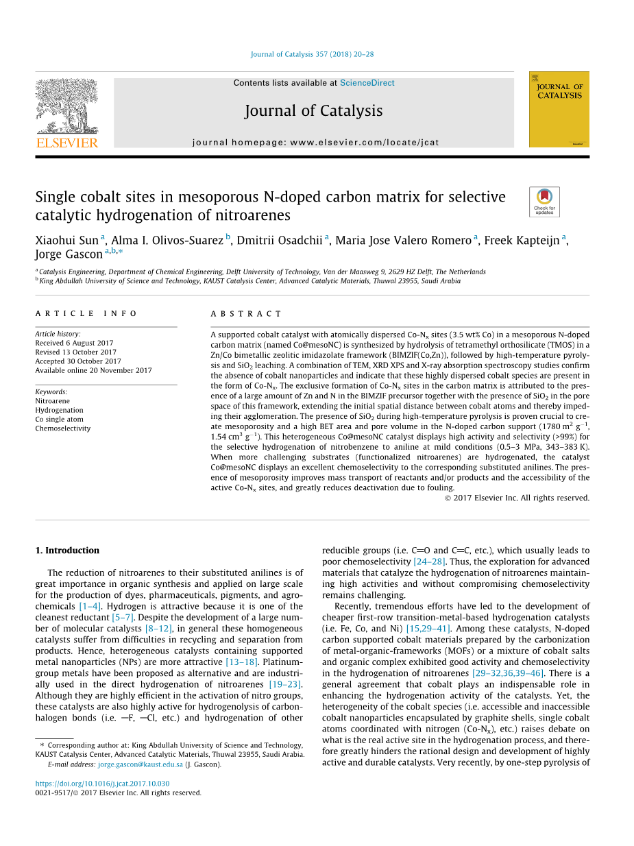 译文出处:Sun X, Olivos-Suarez A I, Osadchii D, et al. Single cobalt sites in mesoporous N-doped carbon matrix for selective catalytic hydrogenation of nitroarenes[J]. Journal of Catalysis, 2018, 357: 20-28.