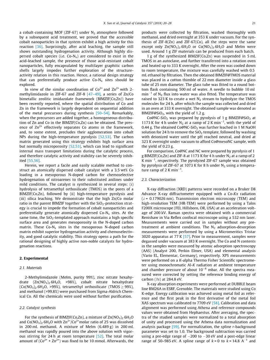 最近,巨大的努力导致开发了更廉价的第一排过渡金属基加氢催化剂(如Fe、Co和Ni)[15,29–41]。在这些催化剂中,通过金属-有机骨架(MOFs)的碳化或钴盐和有机络合物的混合物制备的N掺杂碳载钴材料在硝基芳烃的氢化中表现出良好的活性和化学选择性[29–32,36,39–46]。人们普遍认为钴在提高催化剂的加氢活性中起着不可或缺的作用。然而,钴物质的不均匀性(即石墨壳包裹的可接近和难以接近的钴纳米粒子,与氮配位的单个钴原子(Co-Nx)等)引发了关于加氢过程中什么是真正的活性部位的争论,这极大地阻碍了高效耐用催化剂的合理设计和开发。最近,通过在N2气氛下一步热解含钴MOF(ZIF-67)再进行酸处理,我们证明了该体系中的钴纳米粒子对此反应具有较高的活性[36]。令人惊讶的是,酸浸之后,样品仍显示出优异的加氢活性。尽管高度分散的钴物质(即Co-Nx)被认为存在于酸浸出的样品中,但完全被多层石墨碳壳包封的那些耐酸钴纳米颗粒的存在很大程度上妨碍了在这个反应中对结构活性关系的进一步研究。因此,应该探索可以优先产生活性Co-Nx位点的合理设计策略。