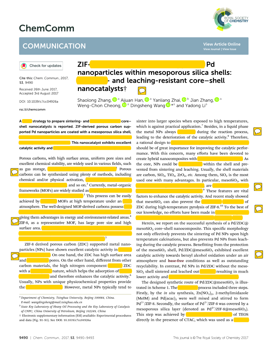 介孔二氧化硅包裹下的负载Pd纳米粒子的基于ZIF型多孔碳材料:抗烧结和抗浸出的核壳纳米催化剂