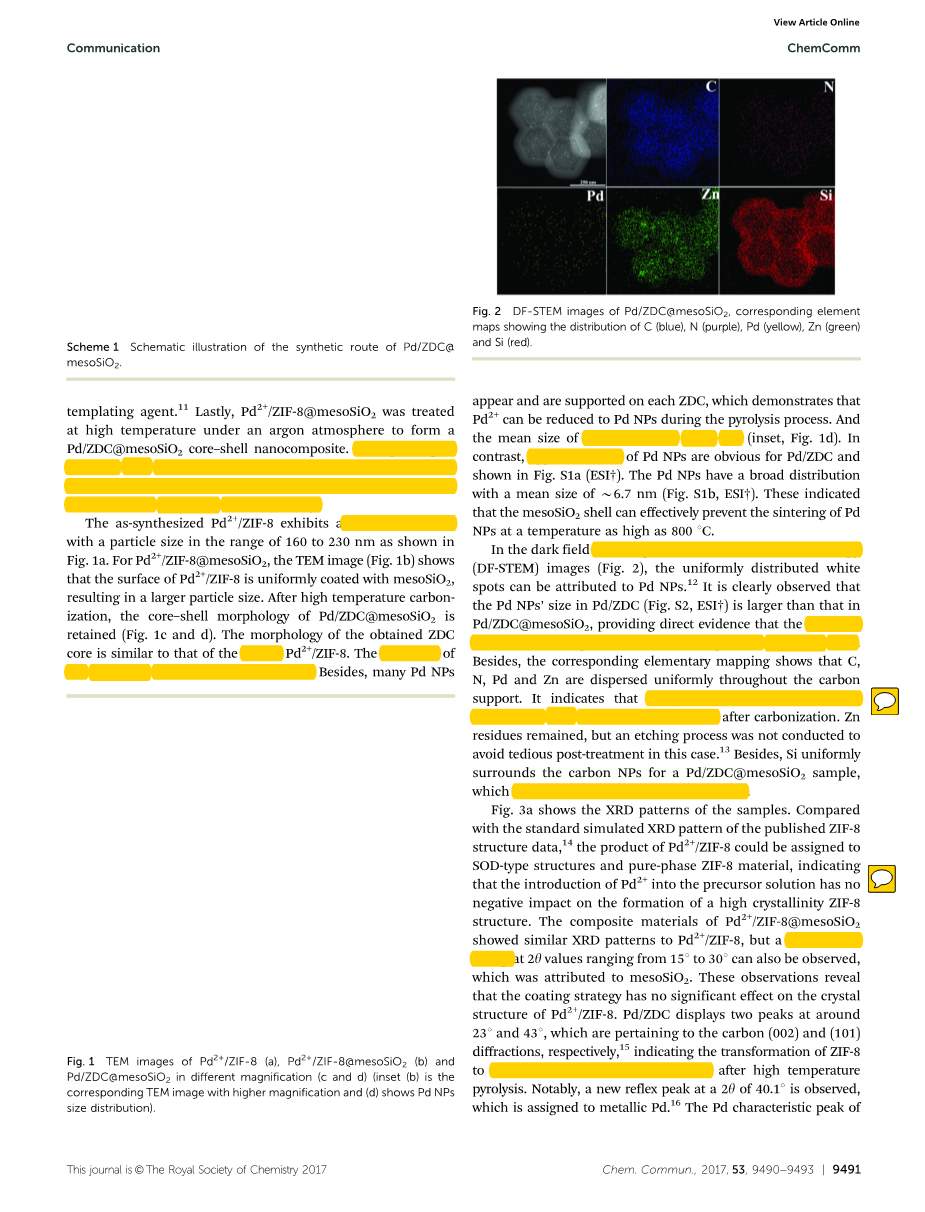在此,我们报道一种Pd/ZDC@mesoSiO2核壳纳米粒子的成功合成。这种特殊的外形,不仅能高效的阻止Pd纳米粒子在高温下的的烧结,同时能防止Pd纳米金属离子在催化进程中的浸出。得益于介孔二氧化硅的保护,Pd/ZDC@mesoSiO2展现出了卓越的催化活性,尤其是在空气氛中的苯甲醇的氧化反应中,而且也展现出了杰出的可重复利用能力。相对应的,Pd纳米金属离子在Pd/ZDC中,由于没有了介孔二氧化硅的外壳保护,在同样的过程中,被严重的烧结和浸出,这导致了它的反应活性和转化反应物的能力都在重复利用后变得异常的低。