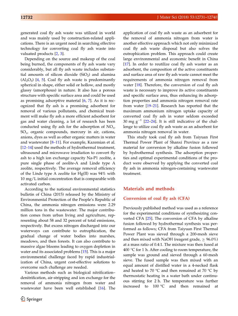 已经建立了各种方法,例如生物硝化-反硝化,汽提和离子交换,来从水和废水中去除氨氮[16]。另一种有效的方法是粉煤灰废料作为吸附剂从水中去除氨氮的应用,它不仅使粉煤灰废料的处理量最小化,而且解决了富营养化问题。这种方法可以在中国创造巨大的环境和经济利益[17]。为了将粉煤灰浪费作为吸附剂再利用,粉煤灰废料的活性成分和表面积不能满足从水中去除氨氮的要求[18]。因此,粉煤灰废物转化是必要的,通过提高其活性成分和比表面积,从而提高了其吸附性能和氨氮去除率[19,20,21]。研究已经报道,氮最大铵摄取转换粉煤灰的容量在水很少超过30mgg-1 [22,23,24]。仍然表明利用粉煤灰废料作为吸附剂去除水中氨氮的挑战。