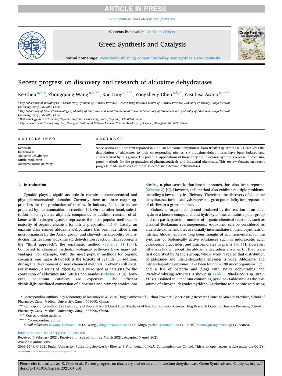 氰化物在化学、制药和植物药剂学领域发挥着重要作用。目前有三种主要的腈生产方法。在工业上,本体腈是通过氨氧化反应制备的[1]。另一方面,卤代脂肪族化合物的取代或烯烃与氰化氢的加成反应代表了大多数有机化学家制备腈的最常用方法[2-4]。最近,Asano集团从微生物中鉴定出一类酶,名为醛肟脱水酶,并显示出通过脱水反应从醛肟中生成腈的能力。这代表了“第三种方法”,即酶法(方案1)[5-7]。与化学方法相比,生物途径有许多优点。例如,对于有机化学家来说,最常用的方法的一个主要缺点是氰化物的毒性。此外,在开发新的化学方法的过程中,仍然存在一些问题。例如,一系列Pd(en)X2盐被用作将醛肟转化为腈和酰胺的催化剂(方案2)[8],然而,钯催化剂价格昂贵。还有一种基于光敏化的方法,即将有效的可见光介导的醛肟和伯酰胺转化为腈(方案3)[9]。然而,这种方法也存在多个问题,包括催化效率低。因此,用于生物催化的醛肟脱水酶的发现代表了以绿色方式制备腈的巨大潜力。