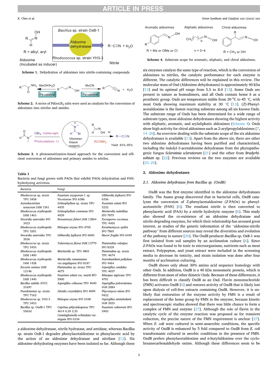 肟是由醛或酮化合物与羟胺反应生成的有机化合物,含有极性基团,可参与许多有机化学反应,如经典的贝克曼重排反应。醛肟可视为醛肟,通常是腈生物合成的中间产物。长期以来,醛肟被认为是合成生物活性物质的中间体,如植物中的吲哚乙酸、氰苷和硫代葡萄糖苷[10,11]。然而,直到Asano的研究小组首次描述醛肟降解酶之前,人们对醛肟降解酶知之甚少,他们的研究表明,醛肟和腈降解酶的分布很广。在188种微生物中发现了醛肟和腈降解酶[12],具有PAOx脱水和PAN水解活性的细菌和真菌列表如表1所示。红球菌YH3-3菌株是在含有吡啶-3-醛肟作为唯一氮源的培养基中分离出来的,该菌株使用醛肟脱水酶、腈水合酶和酰胺酶,而芽孢杆菌菌株OxB-1通过醛肟脱水酶和硝化酶的作用将苯乙醛肟降解为苯乙酸[12]。到目前为止,已经分离出六种醛肟脱水酶。虽然这六种酶催化同一类型的反应,即醛肟转化为腈,每种酶的催化性能不同。本综述将解释催化差异。Oxd(醛肟脱水酶)的分子量约为40 kDa[13],其最适pH范围为5.5至8.0[13]。一些Oxd在自然界中以同型二聚体的形式存在,而所有Oxd都含有血红素b作为修复基团。Oxd的温度在30°C到45°C之间是稳定的,大多数Oxd在30°C表现出最大的稳定性 [13]。(Z) -苯乙醛肟是所有六种已知Oxd中反应最快的底物。Oxd的底物范围已确定,适用于多种底物类型,大多数醛肟脱水酶对脂肪族、芳香族和芳香族醛肟表现出最高的活性(方案4)。Oxd对2-芳基丙基醛肟等手性醛肟表现出高活性[14–20]。关于六种醛肟脱水酶底物范围的概述[13],除上述六种酶外,还有另外两种醛肟脱水酶已得到纯化和表征,包括来自植物病原真菌菌核菌[21]的吲哚-3-乙醛肟脱水酶和来自慢生根瘤菌[22]的吲哚-3-乙醛肟脱水酶。之前关于这两种酶的综述[23–25]。