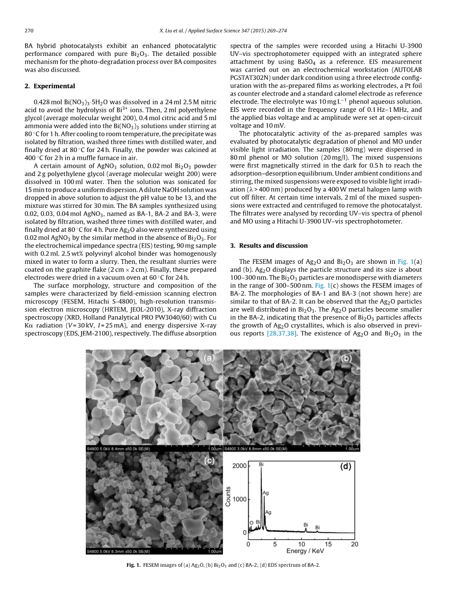Ag2O和Bi2O3的FESEM图像如图1所示(a)及(b)。图中所显示的氧化银粒子结构及其尺寸约为100–300 nm。而氧化铋颗粒分散在300–500 nm直径范围。图1(c)显示BA-2型的FESEM图像。BA-1型、BA-3型的形态在这里并没有显示,但是它们与BA-2型的形态相似。我们可以观察到Ag2O的颗粒很好的分布在Bi2O3上。但是BA-2型中的氧化银颗粒在变小,这表明Bi2O3的存在影响了Ag2O晶体的生长,这也是在以前的报告中所观察到的 [28,37,38]。在EDS波谱上Ag、Bi、O的峰证明了Ag2O-Bi2O3复合材料的存在,如图1(d)所示。