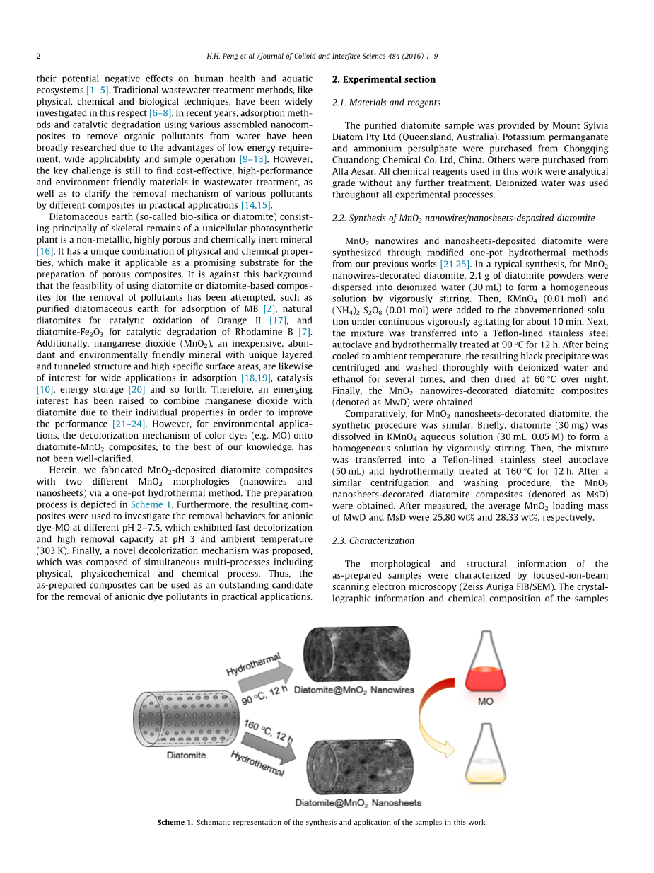 在此,我们通过一步水热法制备了二氧化锰沉积硅藻土复合材料的两种不同形态(二氧化锰纳米线和纳米片)。制备过程如图示1所示。此外,使用所得的复合材料来研究阴离子染料甲基橙在pH为2到7.5时的去除行为,研究显示在pH为3和环境温度下具有快速脱色和高去除能力。最后,提出了一种新的脱色机理,它由物理、物理化学和化学过程等多个过程组成。因此,所制备的复合材料可以在实际应用中用作去除阴离子染料污染物的杰出的材料。