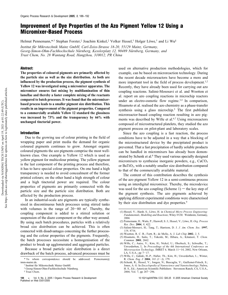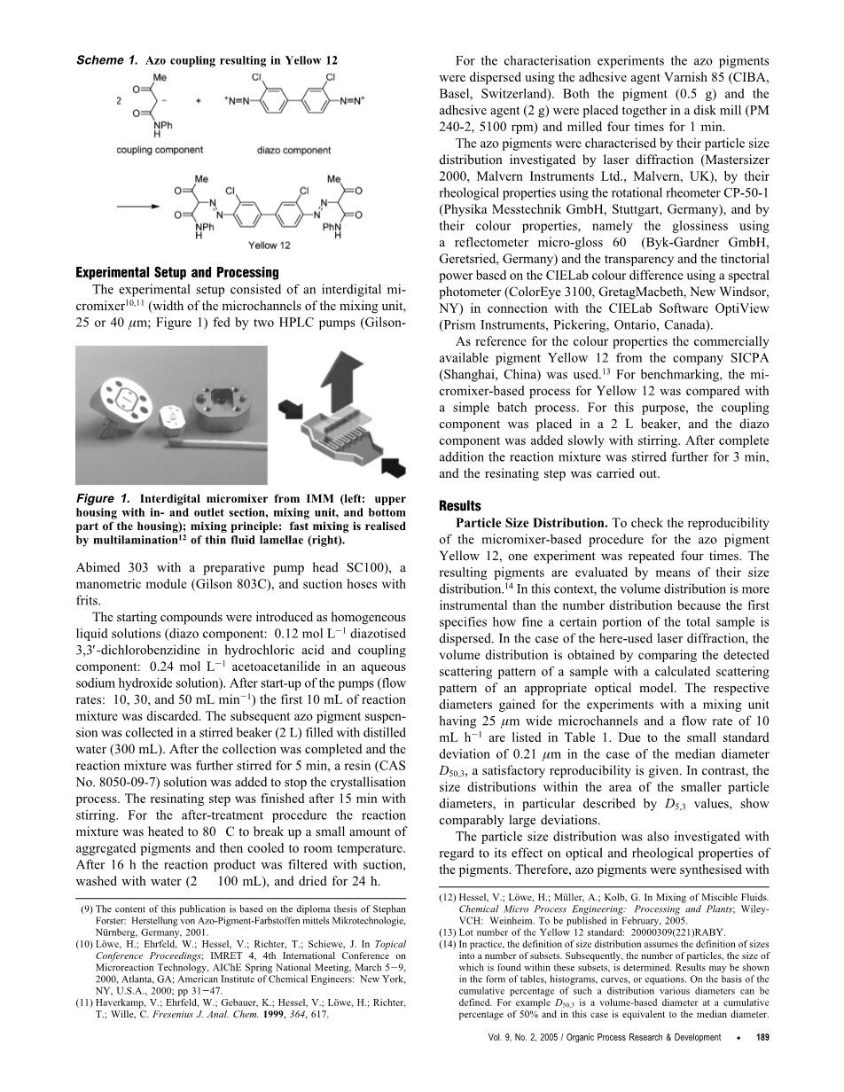 由于偶氮偶合是一种快速反应,因此必须调整工艺条件,以防止沉淀产物阻塞微结构器件。Schenk等人8已经证明了在微混合器中可以处理难溶产物的快速沉淀。他们使用各种特殊设计的微混合器来合成无机粉末,例如CaCO3或BaTiO3,与市售材料相比,其粒度分布明显更小。这一贡献的内容描述了使用叉指微混合器在半连续过程中合成偶氮颜料黄12。因此,将微器件用于偶氮偶联反应(方案1)是颜料合成的关键步骤。采用不同的实验条件制备了偶氮颜料,并对其粒径分布和染色性能进行了表征。