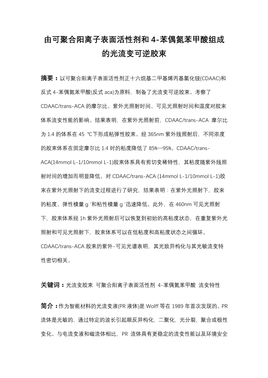 - 由可聚合阳离子表面活性剂和4-苯偶氮苯甲酸组成 的光流变可逆胶束外文翻译资料