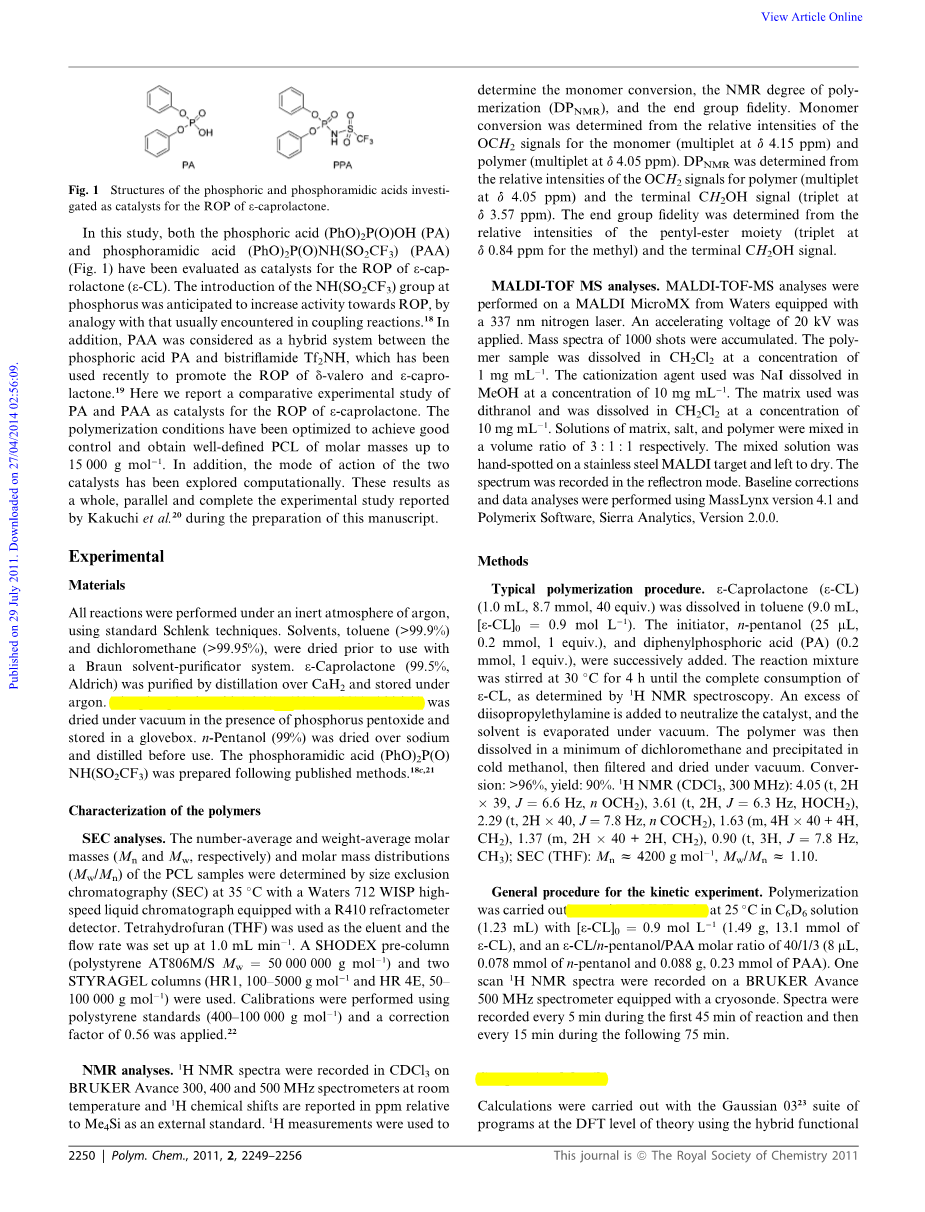 在这项研究中,磷酸(PhO)2P(O)OH(PA)和磷酰胺酸(PhO)2P(O)NH(SO2CF3)(PAA)(图1)均被评估为ε-己内酯(ε-CL)的ROP的催化剂。与偶合反应中通常遇到的类似,在磷处引入NH(SO2CF3)基团有望提高其对ROP的活性[18]。此外,PAA被认为是磷酸PA和双三酰胺Tf2NH之间的杂化体系。最近已被用于促进d-valero和ε-己内酯的ROP[19]。在这里,我们报告了PA和PAA作为ε-己内酯ROP催化剂的对比实验研究。已对聚合条件进行了优化,以实现良好的控制并获得分子量高达15000 g mol-1的定义明确的PCL。此外,已经通过计算探索了两种催化剂的作用方式。这些结果总体上是与Kakuchi等人[20]在编写此手稿时报告的实验研究平行,完整的。