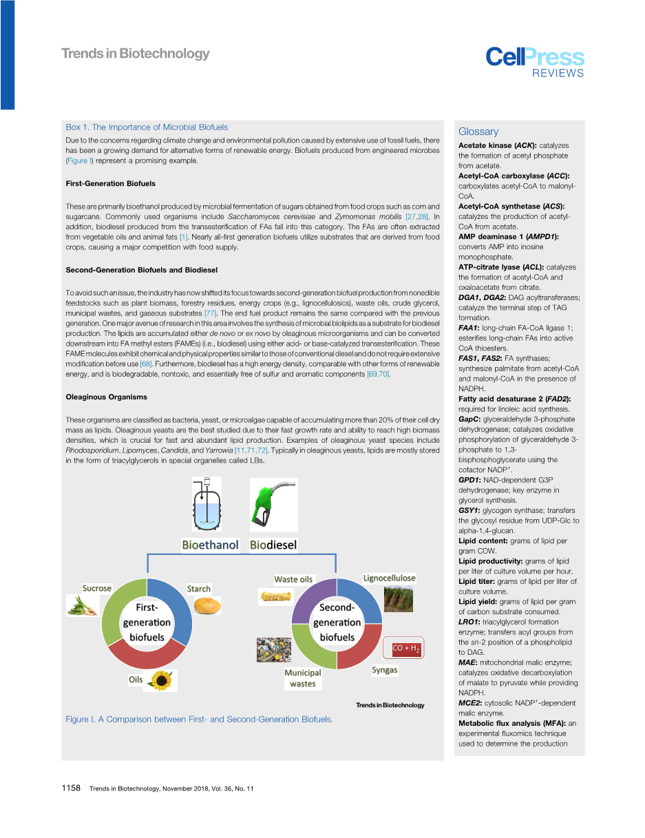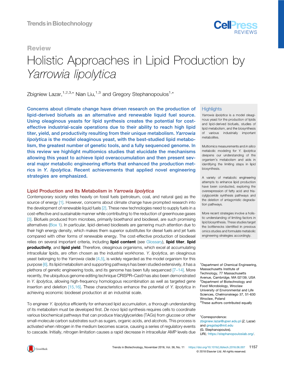 当代社会严重依赖化石燃料(石油、煤炭和天然气)作为能源[1]。然而,对气候变化的担忧推动了人们对可再生液体燃料的研究[2]。这些新技术需要以具有成本效益和可持续的方式提供燃料,同时为减少温室气体做出贡献[3]。由微生物生产的生物燃料,主要是生物乙醇和生物柴油。其中,脂基生物柴油由于其较高的能量密度而备受关注,与其他形式的可再生能源相比,这使其成为柴油和喷气燃料的优越替代品。生物柴油的成本效益取决于几个重要的标准,包括油脂含量、油脂效价、油脂产量和油脂生产力。因此,擅长积累细胞内脂质的油性微生物常被选为工业主力菌。Yarrowia.lipolytica(解脂耶氏酵母),是一种属于Yarrowia属的油性酵母[4,5],被广泛认为是实现这一目的的模式生物[6]。它的脂质代谢相关途径已经得到了广泛的研究,它拥有过多的基因工程工具,它的基因组已经完全测序[7-14]。最近,无处不在的基因组编辑技术CRISPR-Cas9在解脂耶氏酵母中也得到了应用,它允许高频同源重组以及有针对性的基因插入和删除[15,16]。这些特性增强了解脂耶氏酵母实现工业化生产经济生物柴油的潜力。