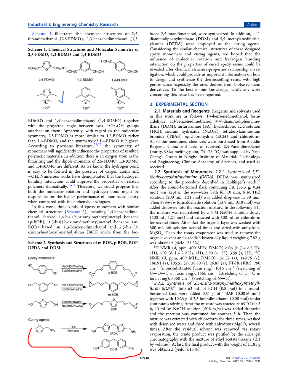 在本研究中,合成了三种具有相似的化学结构的环氧树脂单体 (图2),包括由1,4-苯二甲醇衍生出的1,4-双[(2-环氧乙烷甲氧基)甲基]-苯 (p-BOB)、基于1,3-苯二甲醇的1,3-双[(2-环氧乙烷甲氧基)甲基]-苯(m-BOB)和由生物基2,5-呋喃二甲醇制得的2,5-双[(2-环氧乙烷甲氧基)甲基]-呋喃(BOF)。此外,采用4,4rsquo;-二氨基二苯甲烷(DDM)和5,5rsquo;-亚甲基二糠胺(DFDA)作为固化剂。考虑到这些设计出的化学结构相似的环氧树脂单体和固化剂,我们希望分子旋转和氢键相互作用对固化环氧树脂性能的影响可以在调查化学性质结构关系后被揭示,这可以为我们提供重要的关于如何设计和合成高性能的热固性树脂的信息,尤其是源于生物基的呋喃衍生物。据悉,目前几乎没有任何关于这个问题的研究的相关报道。