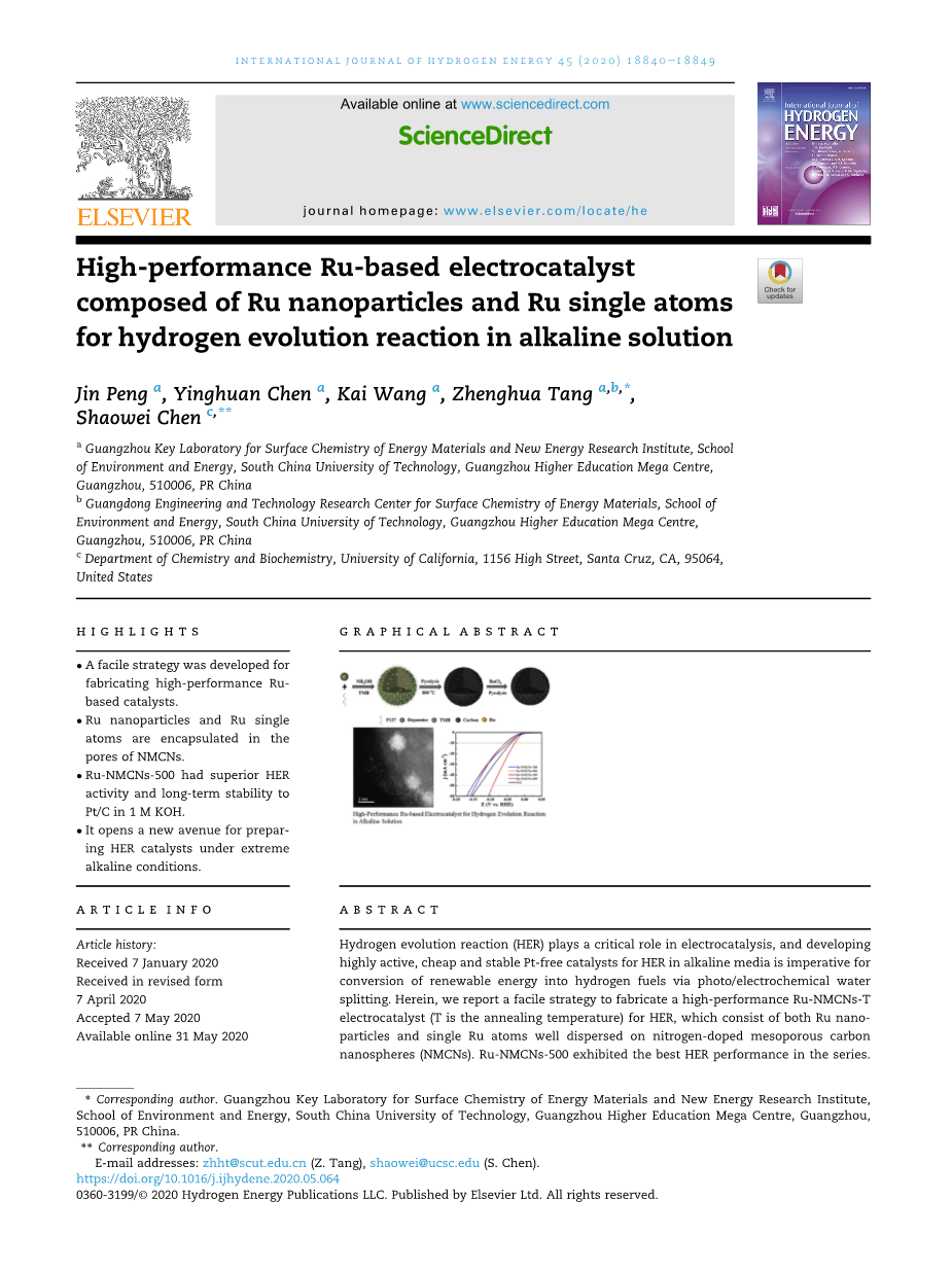 通讯作者:华南理工大学环境与能源学院能源材料与新能源研究所表面化学广州重点实验室,广州高等教育大型中心,广州,510006,中国公共关系。相应的作者电邮地址: zhht@scut. edu. cn (Z. Tang) ,邵伟@ucsc.edu (S. Chen)。Https://doi.org/10.1016/j.ijhydene.2020.05.0640360-3199/copy; 2020氢能出版物有限责任公司出版爱思唯尔有限公司保留所有权利。