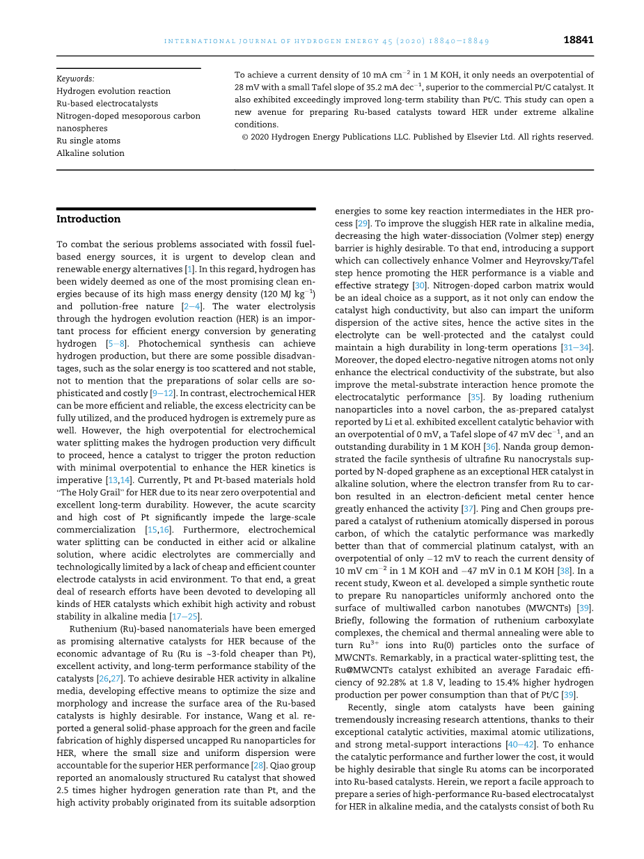 为了解决与化石燃料能源相关的严重问题,发展清洁和可再生能源是当务之急[1]。在这方面,氢被广泛认为是最有前途的清洁能源之一,因为它的高质量能量密度(120兆焦耳千克1)和无污染的性质[2-4]。水电解通过析氢反应(她)是一个重要的过程,为能量转换的高效率。光化学合成可以实现氢的生产,但也有一些可能的缺点,如太阳能太分散和不稳定,更不用说太阳能电池的制备是复杂和昂贵的[9-12]。相比之下,电化学法更加高效可靠,多余的电能得到充分利用,产生的氢气也极其纯净。然而,电化学水分解的高过电位使得氢的生成非常困难,因此,一种催化剂以最小的过电位触发质子还原来增强其动力学是必要的[13,14]。目前,Pt 和 Pt 为基础的材料对她来说是“圣杯” ,因为它几乎没有过高的潜力,而且具有长期的耐用性。然而,Pt 的急性缺乏和高成本显著阻碍了大规模的商业化[15,16]。此外,电化学水分解可以在酸性或碱性溶液中进行,在酸性环境中,由于缺乏廉价有效的反电极催化剂,酸性电解质在工业上和技术上都受到限制。为此,大量的研究工作致力于开发其在碱性介质中具有高活性和稳定性的各种催化剂[17-25]。钌基纳米材料由于其经济价格比铂低3倍,具有优良的催化活性和长期稳定性等优点而成为一种很有前途的替代催化剂[26,27]。为了获得理想的碱催化活性,开发有效的方法来优化钌基催化剂的粒径和形貌,增加其表面积是十分必要的。例如,Wang 等人报道了一种通用的固相方法,用于高度分散、无帽的 Ru 纳米粒子的绿色化和容易加工,其中小尺寸和均匀分散是其优异性能的原因[28]。乔介绍了一种异常结构的 Ru 催化剂,其产氢速率比 Pt 高2.5倍,其高活性可能来源于其良好的吸附性能能量到一些关键的反应中间物在她的过程[29]。为了改善在碱性介质中的缓慢反应速率,降低高水解离度(伏尔迈)能量障碍是十分必要的。为此,引入一种能够共同提高 Volmer 和 Heyrovsky/Tafel步骤的支持,从而促进她的表演是一种可行的有效策略[30]。掺氮碳基体是一种理想的载体材料,它不仅能赋予催化剂高的导电性,而且能使活性中心具有均匀分散性,从而保护电解液中的活性中心,使催化剂在长期使用中保持较高的耐久性[31-34]。此外,掺杂的电负氮原子不仅提高了衬底的电导率,而且改善了金属-衬底的相互作用,从而提高了电催化性能。通过负载钌纳米粒子到一个新的碳,由李等人移植的催化剂,表现出良好的催化行为超过0 mV 的电位,一个 Tafel 斜率为47 mV dec-1,并在1 M KOH [36]出色的耐久性。研究表明,以石墨烯为载体的超细 ru 纳米晶体是一种优异的碱性催化剂,由 Ru 转化为电子转移,形成缺电子的金属中心,极大地提高了催化剂的活性[37]。Ping 和 Chen 组合合成了钌催化剂,其催化性能优于商品铂催化剂,超电位仅为12 mV,在1 M KOH 中的电流密度为10 mV cm-2,在0.1 M KOH 中的电流密度为47 mV[38]。在最近的一项研究中,Kweon 等人开发了一种简单的合成路线,用于制备均匀固定在多壁碳纳米管(mwcnts)表面的 Ru 纳米粒子。简单地说,在形成钌羧酸盐复合物之后,化学和热退火能够将钌离子转变成 Ru (0)粒子到 MWCNTs 表面。显然,在实际的水分解试验中,Ru@MWCNTs 催化剂在1.8 V 时的平均法拉第效率为92.28% ,比 Pt/C [39]提高了15.4% 。近年来,由于单原子催化剂的催化活性、最大原子利用率和强的金属-载体相互作用,单原子催化剂受到了极大的关注。为了提高催化性能,进一步降低成本,在钌基催化剂中引入单个钌原子是十分可取的。本文报道了一种简便的方法,在碱性介质中制备了一系列高性能的钌基电催化剂纳米颗粒和单个钌原子均匀分散在氮掺杂的介孔碳纳米球表面。在 Ru-NMCNs-T (T 为退火温度)系列中,Ru-NMCNs-500样品在1 M KOH 中的活性最好,优于商品 Pt/C 催化剂。长期稳定性优于 Pt/C,稳定性强。