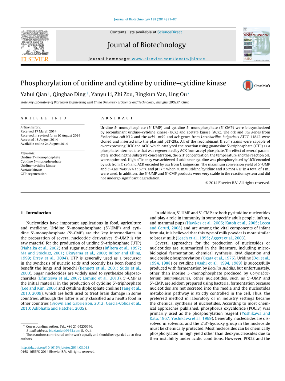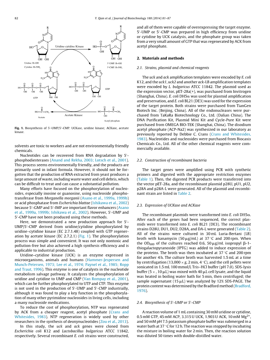 本研究分别从大肠杆菌K12和保加利亚乳杆菌ATCC 11842中克隆了UCK 和ACK基因。构建了几种重组大肠杆菌菌株, 它们都能够高效表达目的酶。以尿苷或胞苷为原料,在UCK催化下高效制备5-UMP或5-CMP,磷酸基取自磷酸乙酯经ACK再生的极少量GTP。