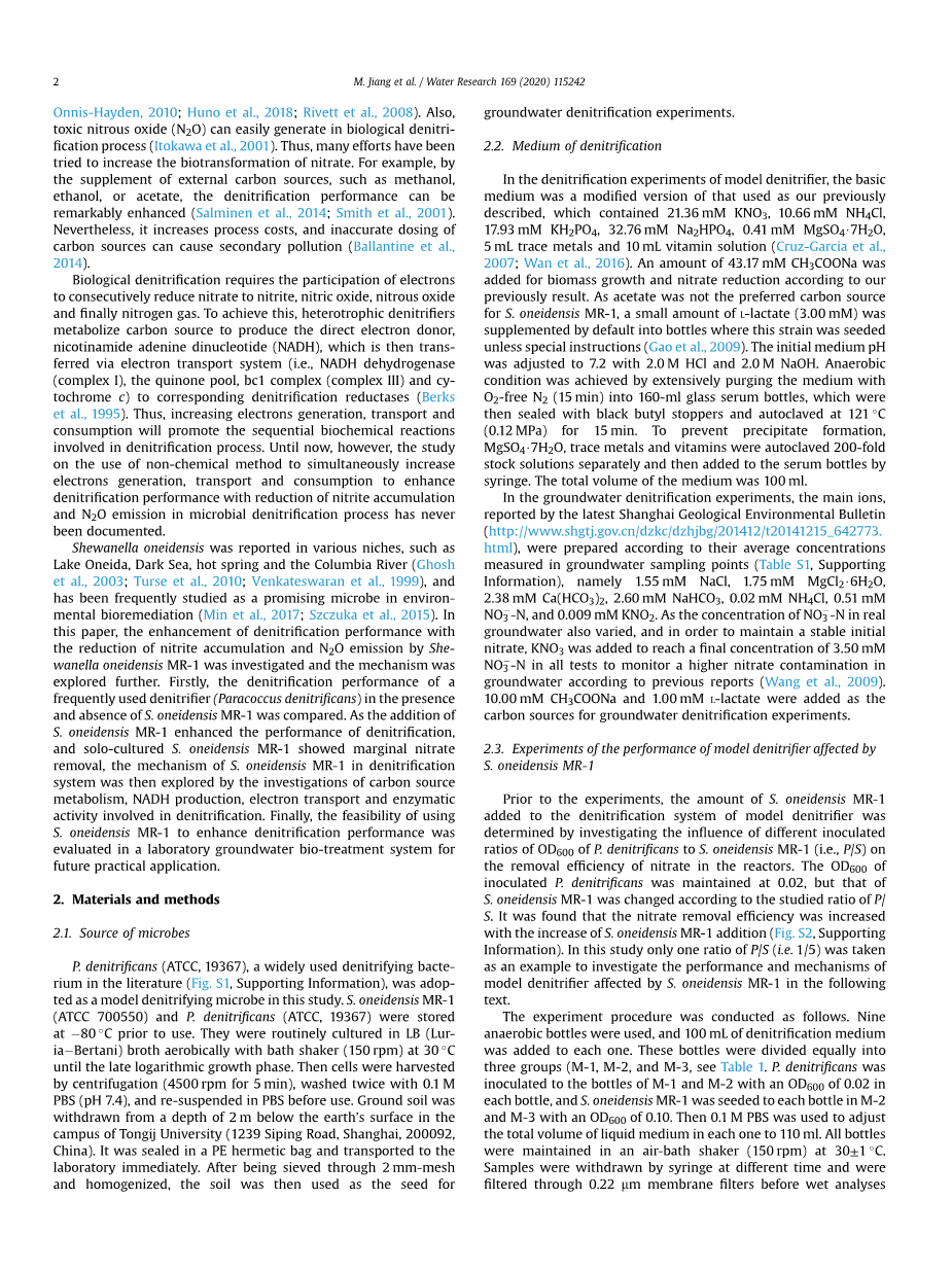 生物反硝化需要电子的参与,将硝酸盐连续还原为亚硝酸盐、一氧化氮、氧化亚氮,最后是氮气。为了达到这个目标,异养反硝化细菌代谢碳源产生直接电子供体,烟酰胺腺嘌呤二核苷酸(NADH),然后通过电子传递系统传输(例如,NADH脱氢酶(复合物I),醌池,群体bc1复合物(复合物III)和细胞色素c转化到相应的反硝化还原酶(博克斯等人., 1995)。因此,增加电子的产生、传输和消耗将促进反硝化过程中涉及的一系列生化反应。然而,利用非化学方法同时增加电子的产生、传输和消耗来提高反硝化性能,同时减少微生物反硝化过程中亚硝酸盐的积累和N2O的排放,迄今尚未见文献报道。奥奈达希瓦氏菌MR-1在不同的生态位被报道,如奥内达湖、黑海、温泉和哥伦比亚河(Ghoshl.等人, 2003;Turse等人,2010;Venkateswaran等人,1999年),并作为一种在环境生物修复方面很有前途的微生物被频繁研究(Min等人,2017;Szczuka等人,2015年)。本文研究了奥奈达希瓦氏菌MR-1通过降低亚硝酸盐积累和N2O排放来提高反硝化性能,并对其机理进行了进一步探讨。首先,比较了一种常用的反硝化菌(副钩藻)在存在和不存在奥奈达希瓦氏菌MR-1时的反硝化性能。作为它的补充,奥奈达希瓦氏菌MR-1增强了脱氮的性能,单独培养的奥奈达希瓦氏菌MR-1显示了少量的硝酸盐去除,这是奥奈达希瓦氏菌MR-1的反硝化机理。通过对碳源的研究对该体系的代谢,NADH生产、电子传递和酶促脱氮所涉及的反应进行了研究。最后,在试验室地下水生物处理系统中评价了利用奥奈达希瓦氏菌MR-1增强反硝化性能的可行性,为今后的实际应用提供参考。