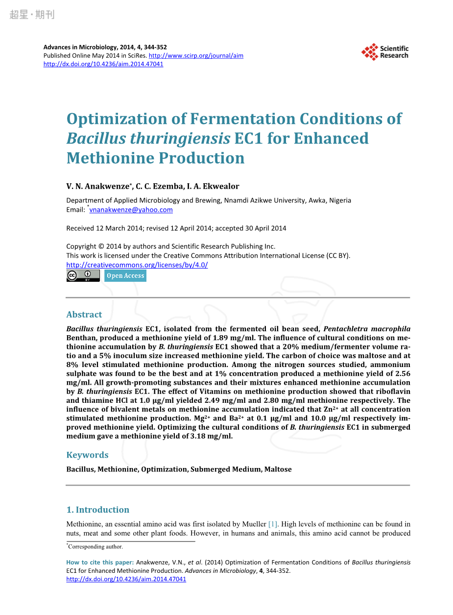 从发酵食品中分离的蛋氨酸生产商苏云金芽孢杆菌EC1被发现在水下培养基中积累了1.89 mg / ml的蛋氨酸。分离作为蛋氨酸生产者的芽孢杆菌属生物与其他研究者的工作一致[14]。然而,作为棒状杆菌、短杆菌和节杆菌的物种,芽孢杆菌还不知道是非常活跃的生产者[8] [15]。