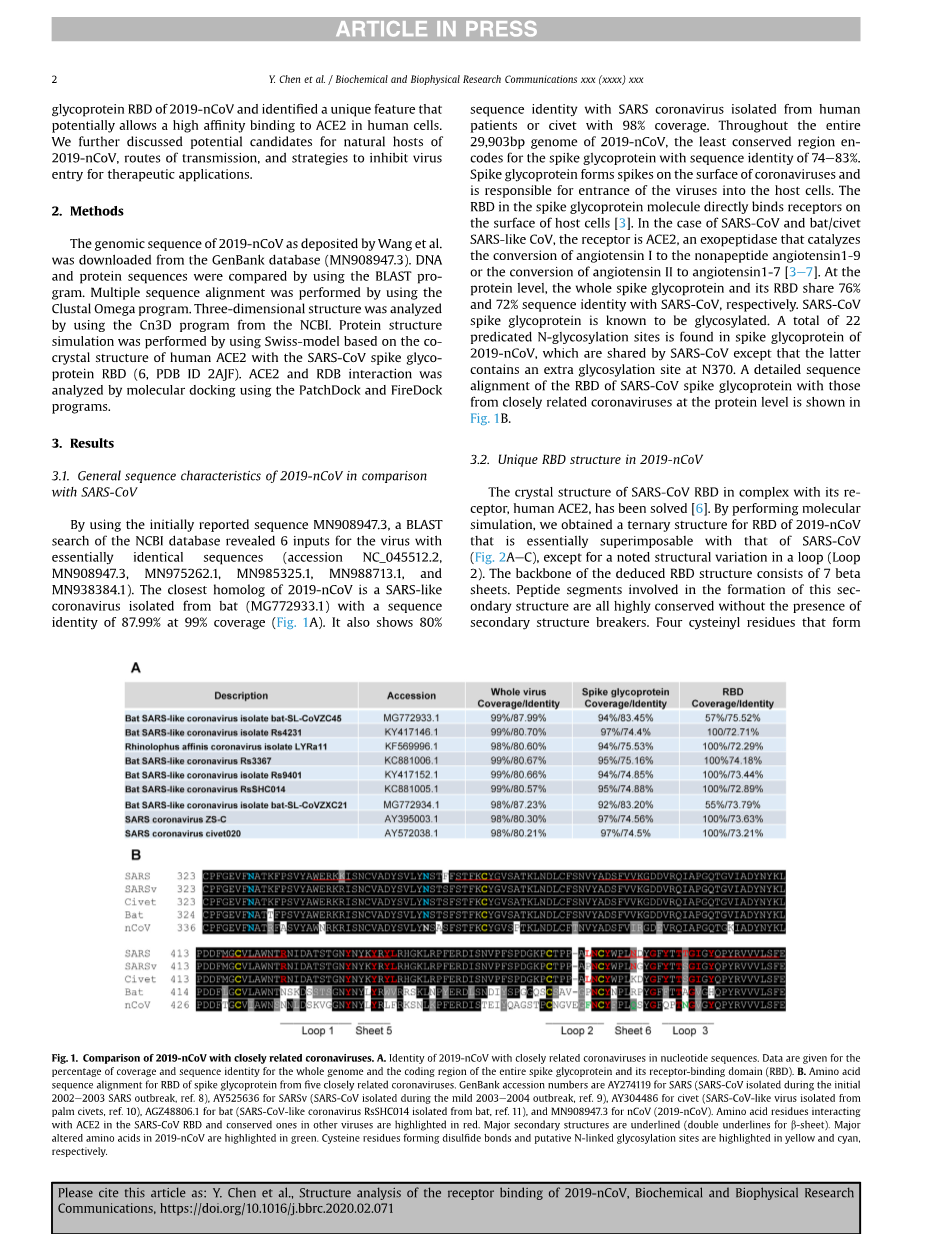 Wang等人保存的2019-nCoV基因组序列从GenBank数据库(MN908947.3)下载。用BLAST程序比较DNA和蛋白序列。利用Clustal Omega程序进行多序列比对。利用NCBI的Cn3D程序进行三维结构分析。采用基于人类ACE2共晶结构的Swiss-model与SARS-CoV spike糖蛋白RBD (6, PDB ID 2AJF)进行蛋白结构模拟。采用PatchDock和FireDock程序进行分子对接,分析ACE2与RDB的相互作用。