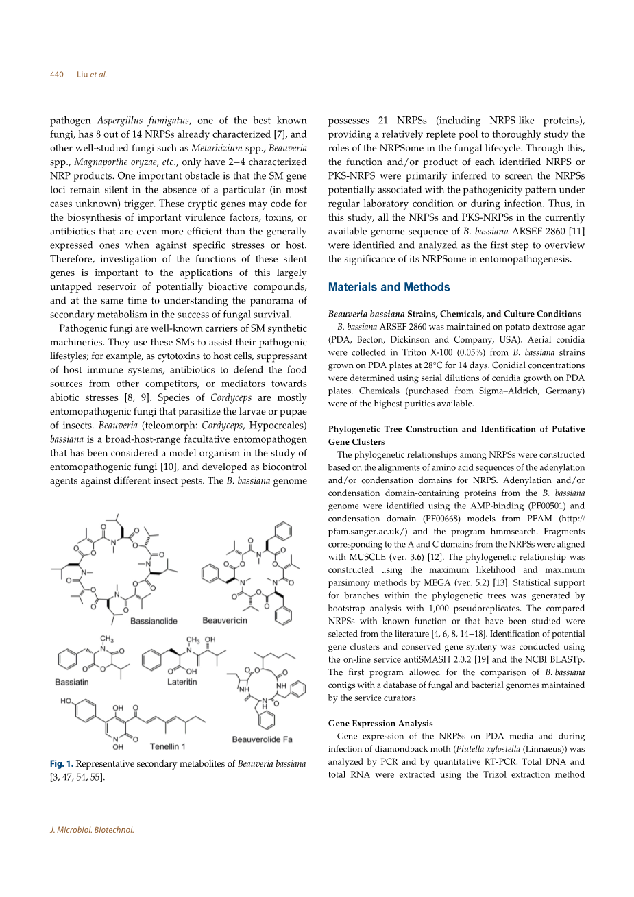 高度保守的结构域能够快速识别鉴定在给定基因组中NRPS和PKS基因。基因簇的共调控提高了通过计算机提取生物合成途径的信心。近年来,可用真菌基因组的增加和基因组技术的快速发展已成功地将许多先前已知或新化合物与其遗传基础相关联,例如在曲霉属的深入研究中。然而,越来越明显的是,在实验室发酵条件下观察到的代谢谱不能反映大量预测出的微生物的生物合成基因。烟曲霉(Aspergillus fumigatus)是最著名的真菌之一,已经鉴定出14种NRPS中的8种,而其他经过深入研究的真菌(如绿僵菌,白僵菌,稻瘟病菌等)也只有2-4个被鉴定的NRP产物。SM基因位点在没有特定(大多数情况下未知)触发因素的情况下保持沉默,这是一个重要的障碍。这些“沉默”基因可能编码重要的毒力因子,毒素或抗生素的生物合成,这些抗毒因子,毒素或抗生素在抵抗特定压力或宿主时比一般表达的效率更高,因此,研究这些沉默基因的功能对于这一尚未开发的潜在生物活性化合物库的应用是非常重要的,同时了解次生代谢在真菌生存中的成功前景。病原真菌是SM合成的知名载体。他们使用这些SM来协助其致病方式。例如,作为宿主细胞的细胞毒素,宿主免疫系统的抑制剂,保护食物来源不受其他竞争者侵害的抗生素,或面对非生物胁迫的介质。虫草的种类大多数是昆虫病原真菌,可寄生昆虫的幼虫或蛹。球孢白僵菌(球孢白僵菌:冬虫夏草,Hypocreales)是一种宿主范围广的兼性昆虫病原体,被认为是昆虫病原真菌研究的模式生物,并已发展成为针对不同害虫的生物防治剂。球芽孢杆菌基因组拥有21个NRPS(包括NRPS类似44蛋白),提供了一个相对丰富的库来彻底研究特定NRP在真菌生命周期中的作用。由此,主要推断出每种已鉴定出的NRPS或PKS-NRPS的功能或产物,以筛选在常规实验室条件下或在感染期间可能与致病性模式相关的NRPS。因此,在这项研究中,鉴定和分析了当前球芽孢杆菌ARSEF 2860 [11]的基因组序列中所的有NRPS和PKS-NRPS,作为概述其特定NRPSs在昆虫发病机理中意义的第一步。