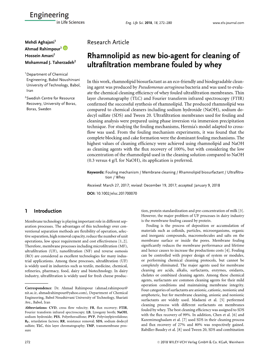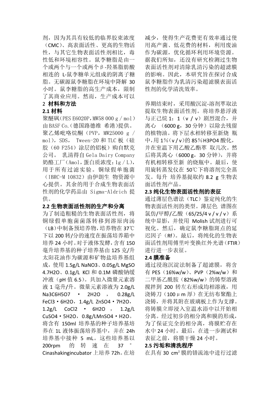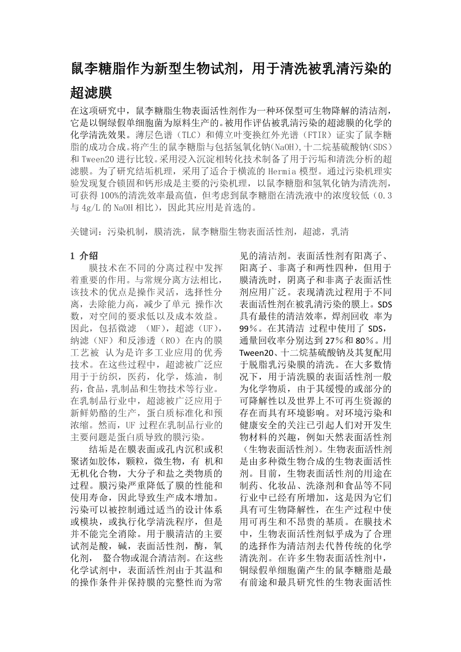 鼠李糖脂作为新型生物试剂,用于清洗被乳清污染的超滤膜外文翻译资料